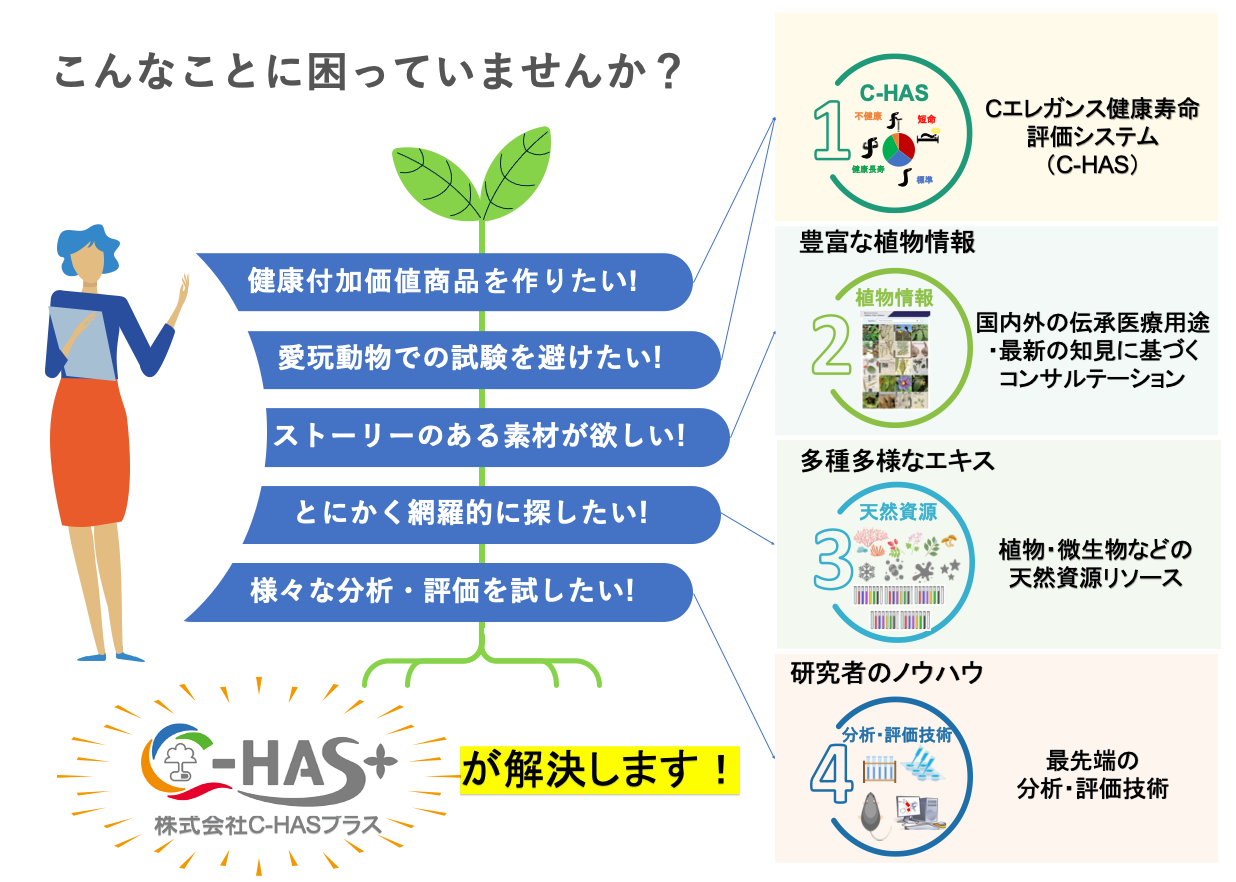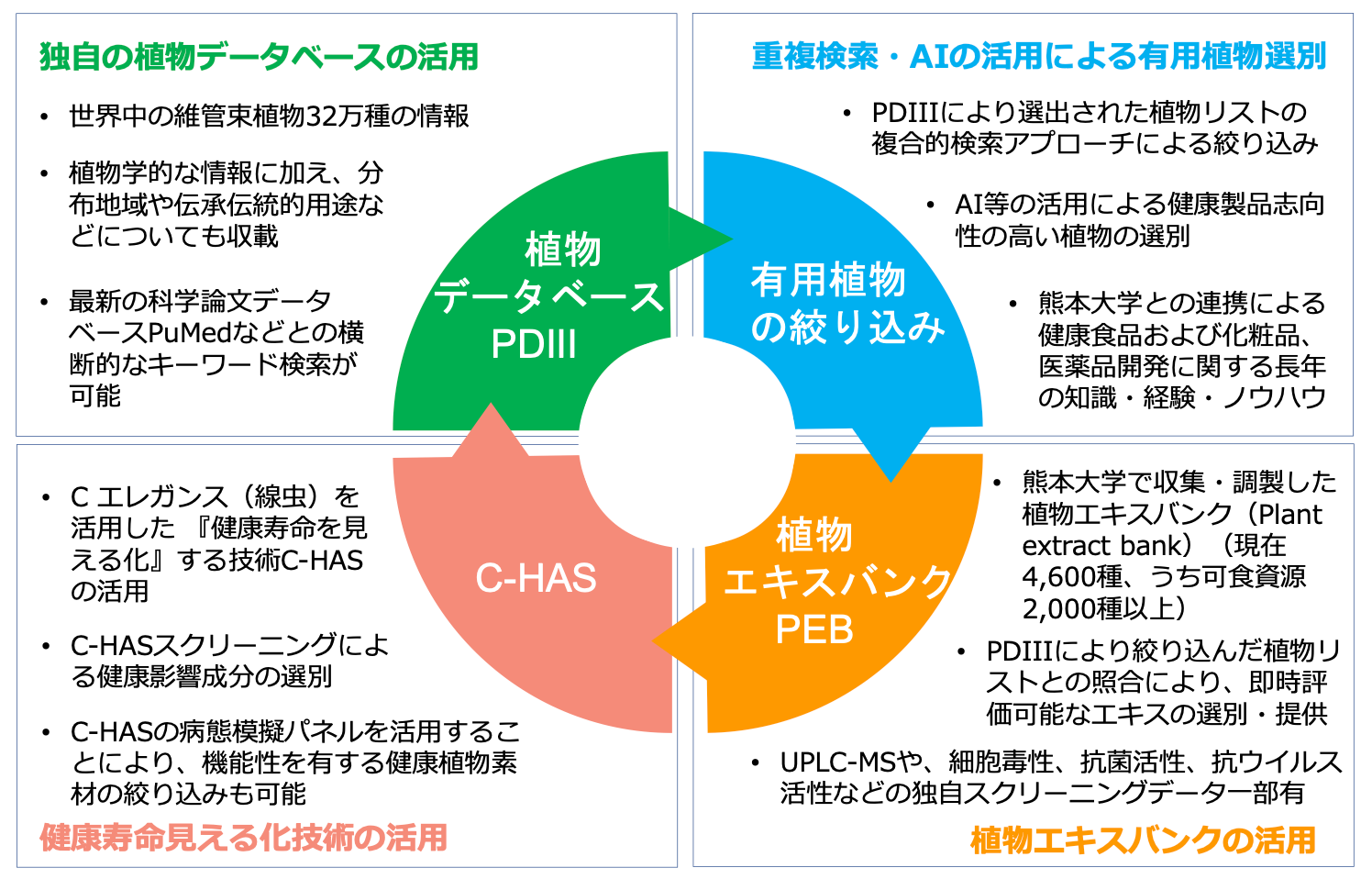 Cエレガンスを活用した評価のみならず、「化粧品や機能性食品の原材料となる植物素材に関する情報」を独自の植物データベースや知識・経験・ノウハウ等の活用により、網羅的かつ効率的に調査し、提供することが可能です。さらに情報提供のみならず、独自のエキスバンクや最新の科学技術を活用した機能性食品や化粧品等の開発なども可能です。シーズの枯渇や資源の入手リスクなど課題を抱えている企業様に対して、世界中のかつ有用なシーズを探索し提案し、開発を支援します。