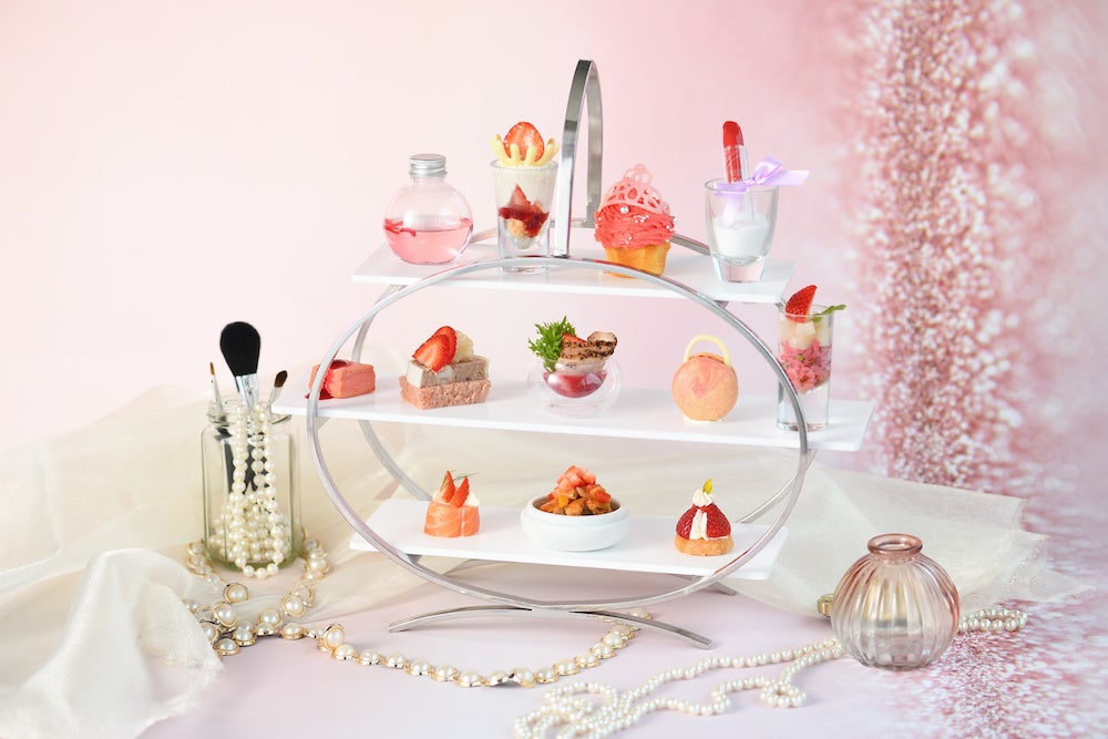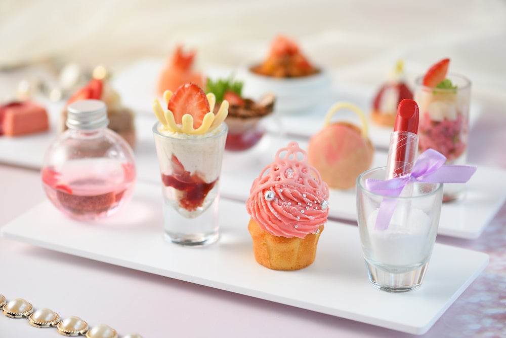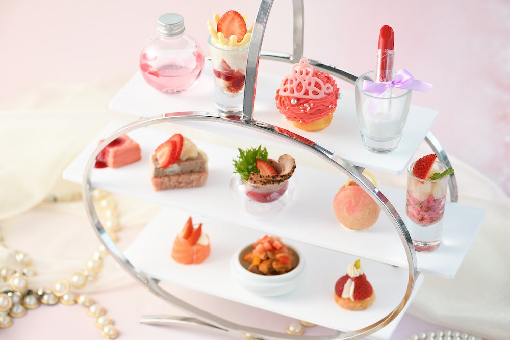 チョコレートのリップスティックや、マーブル模様が愛らしいマカロンバッグ、香水に見立てたベリーとローズの飲むスイーツなど、モチーフが散りばめられたスタンドはまるでドレッサーのよう。もちろん、名物の苺のミルフィーユもお愉しみいただけます。