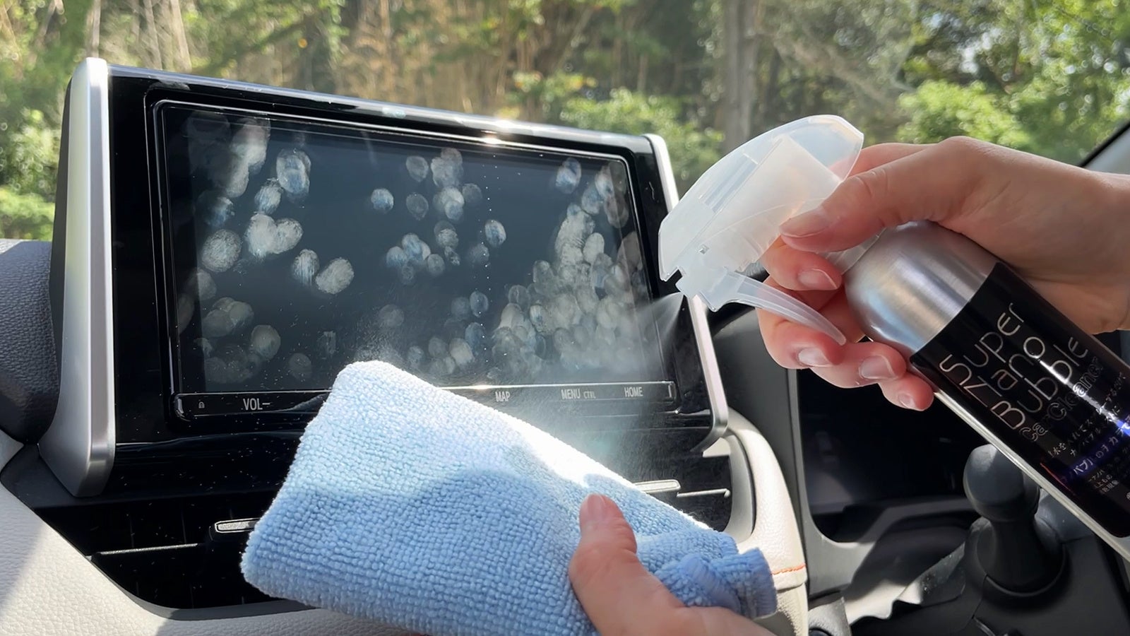 特許技術のナノバブル発生コアが組み込まれた「スーパーナノバブルスプレー」なら、お出かけ先でも水を入れてスプレーするだけで、水道水がナノバブル水となり、サッと愛車をお手入れできます。