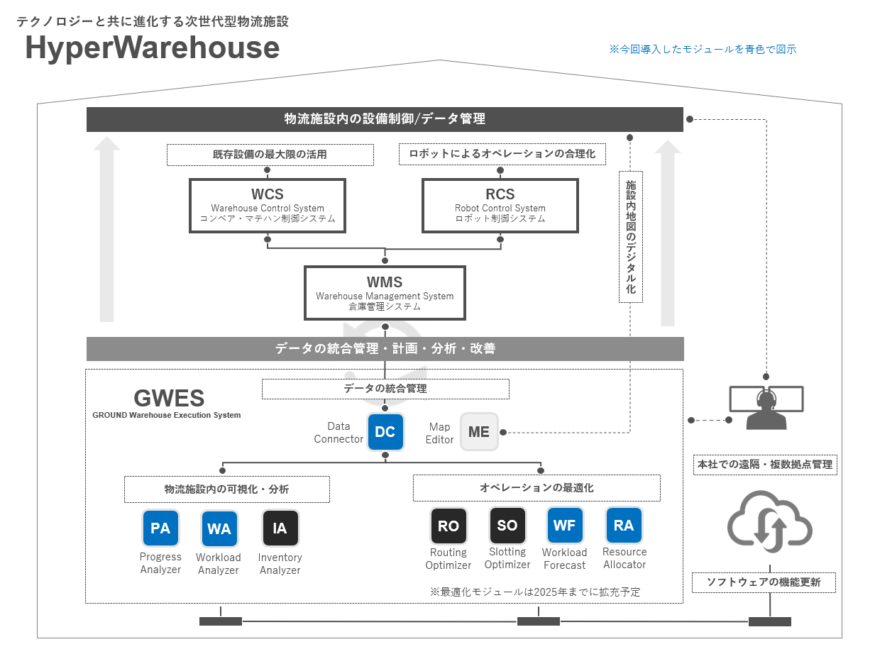 ※1:「HyperWarehouse」とは、GROUNDが提唱する次世代型物流施設のことです。物流施設内の各工程の作業進捗状況、マテハン機器やロボットの稼働状況・人員配置や作業効率等、データに基づき適時把握し最適化することで、人の介在余地を最小化した施設環境を提供します。さらには施設間のデータを連携させることで複数の拠点を同時に最適化することも可能です。GWESはオペレーションシステム(OS)としてその基盤となり、それぞれの機能を常に進化させていきます。