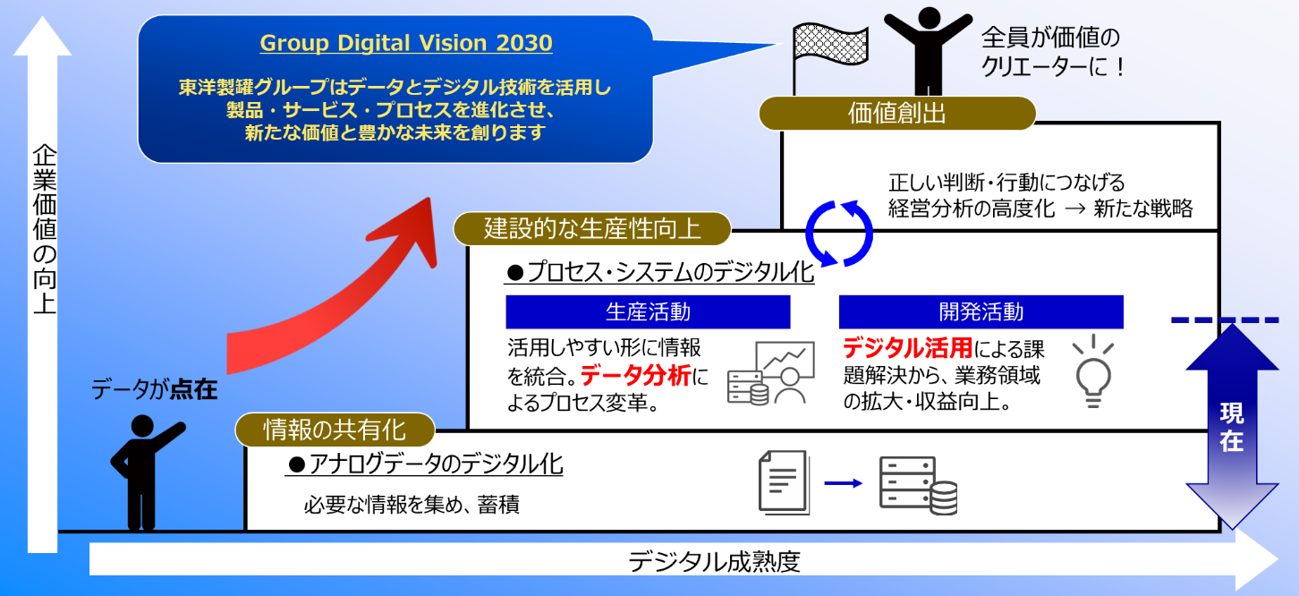 東洋製罐グループは長期経営ビジョン2050「未来をつつむ」の実現に向け、最新のデジタル技術やデータ基盤を最大限活用することで、「競争力の源泉」を更に進化させることを目指し、デジタル化社会におけるグループのあるべき姿「Group Digital Vision 2030」を制定します。
