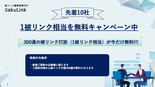 ただいまSakuLinkでは、新規ご契約いただいた先着10社様に1被リンク相当(300通の打診)を無料でプレゼントするキャンペーンを行っています。