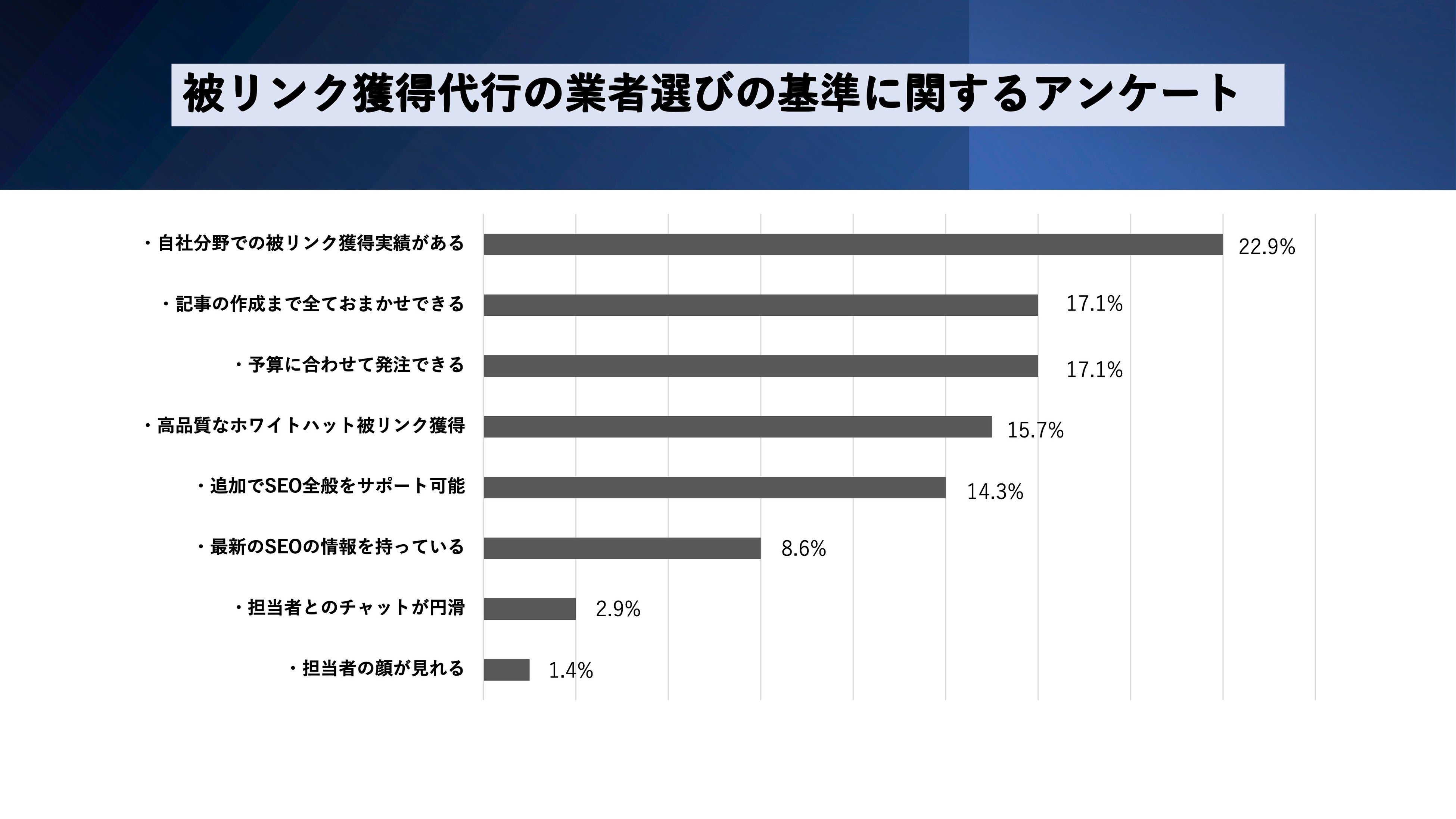 さまざまな被リンク獲得代行サービスが展開されている中、発注者側が業者選びにおいて重視している基準に関して、弊社が行ったアンケート結果を無料公開します。