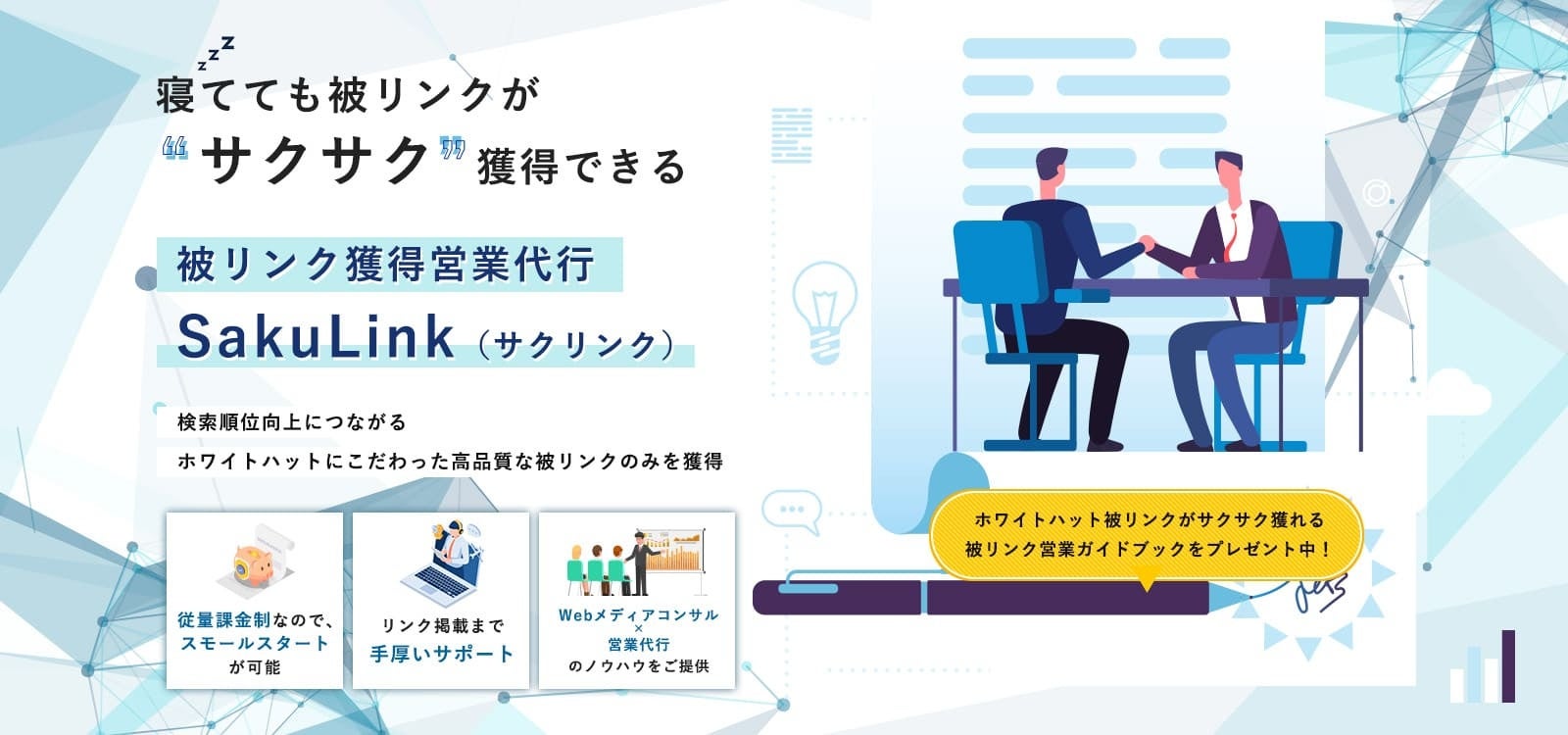 SakuLink(サクリンク)は、Webに精通したプロのコンサルティングチームが、貴社の被リンク獲得をまるっと代行したします。