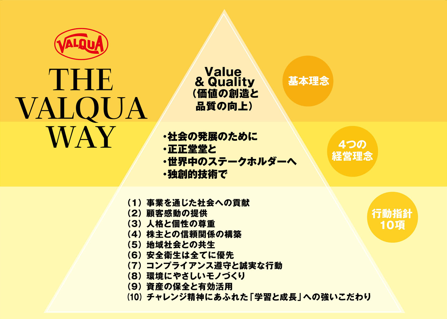 バルカーの基本理念と4つの経営理念、10の行動指針を定めたもの。社名の由来でもある企業理念「THE VALQUA WAY」(バルカーウェイ)を経営理念の基軸に据えている。