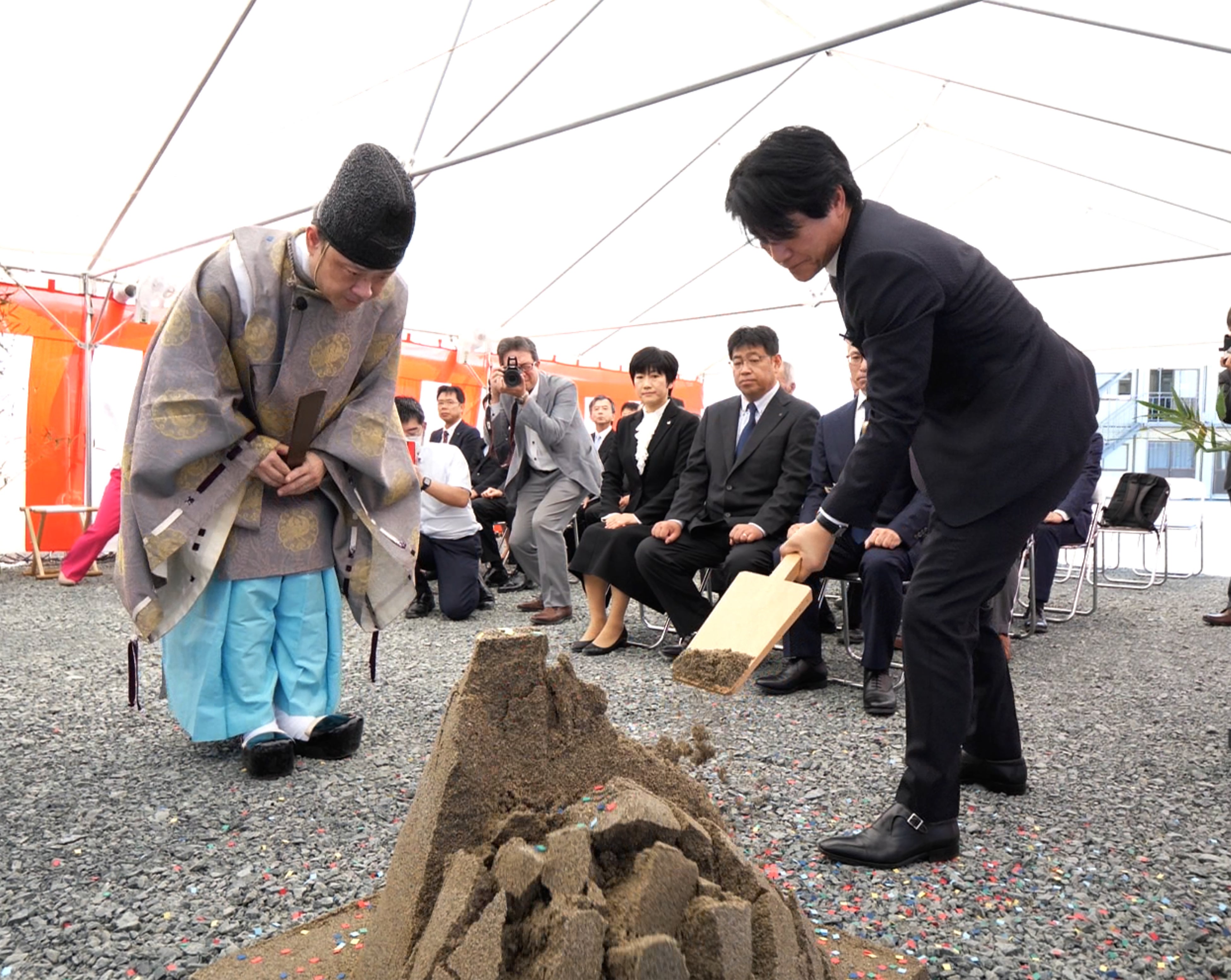 地鎮祭は、バルカーCEO瀧澤のほか、愛知県田原市の鈴木正直 副市長や施工関係者、メディア関係者にご参列いただいたほか、社内関係者に向けてオンライン中継のハイブリット対応も行い、工事の安全を祈願しました。