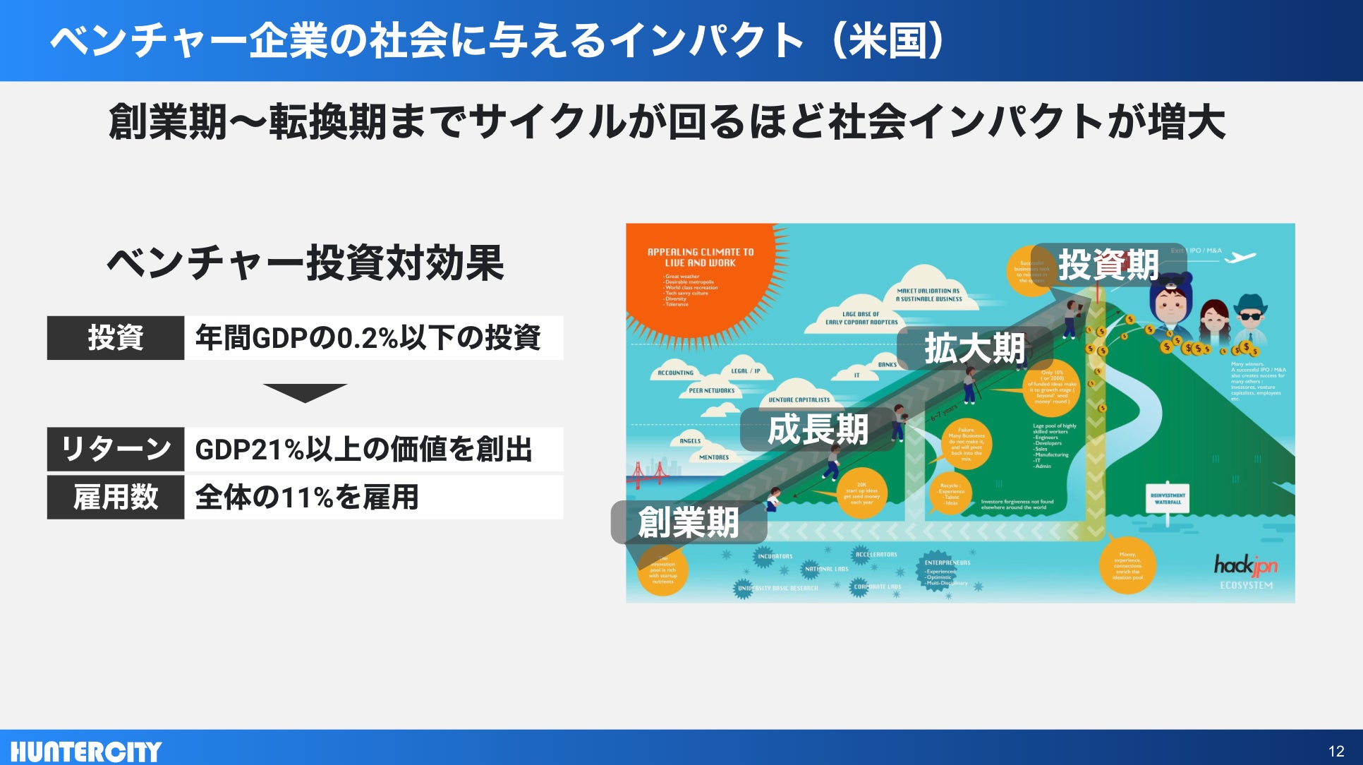 米国では年間GDP0.2%も満たないベンチャー投資額がGDP21%を引き上げ、雇用全体の11%をベンチャー企業が担っているという数字があり、ベンチャー企業の創出が国力を引き上げる鍵となっております。そのため創業期から上場までの支援が国策としても充実しており、ベンチャー投資額は我が国が8700億円に対して、米国が33兆円と約40倍もの差が開いております。