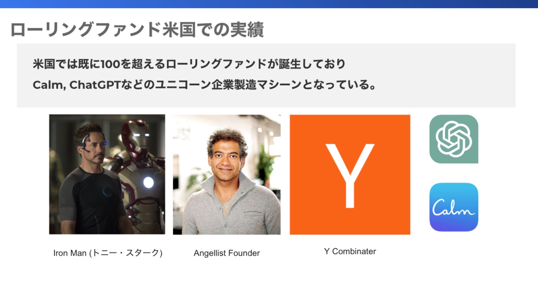 ChatGPTで知られる、Open AI。マインドフルネス領域でユニコーン入りしているCalmなど。米国では既に100を超えるローリングファンドが立ち上がっています。アイアンマンの主演俳優で著名である、Robert Downey Jrや現役のメジャーリーガーがファンドのパートナーとなっており、様々な分野に投資が実行され、ユニコーン企業の創造に必要不可欠な存在となっております。