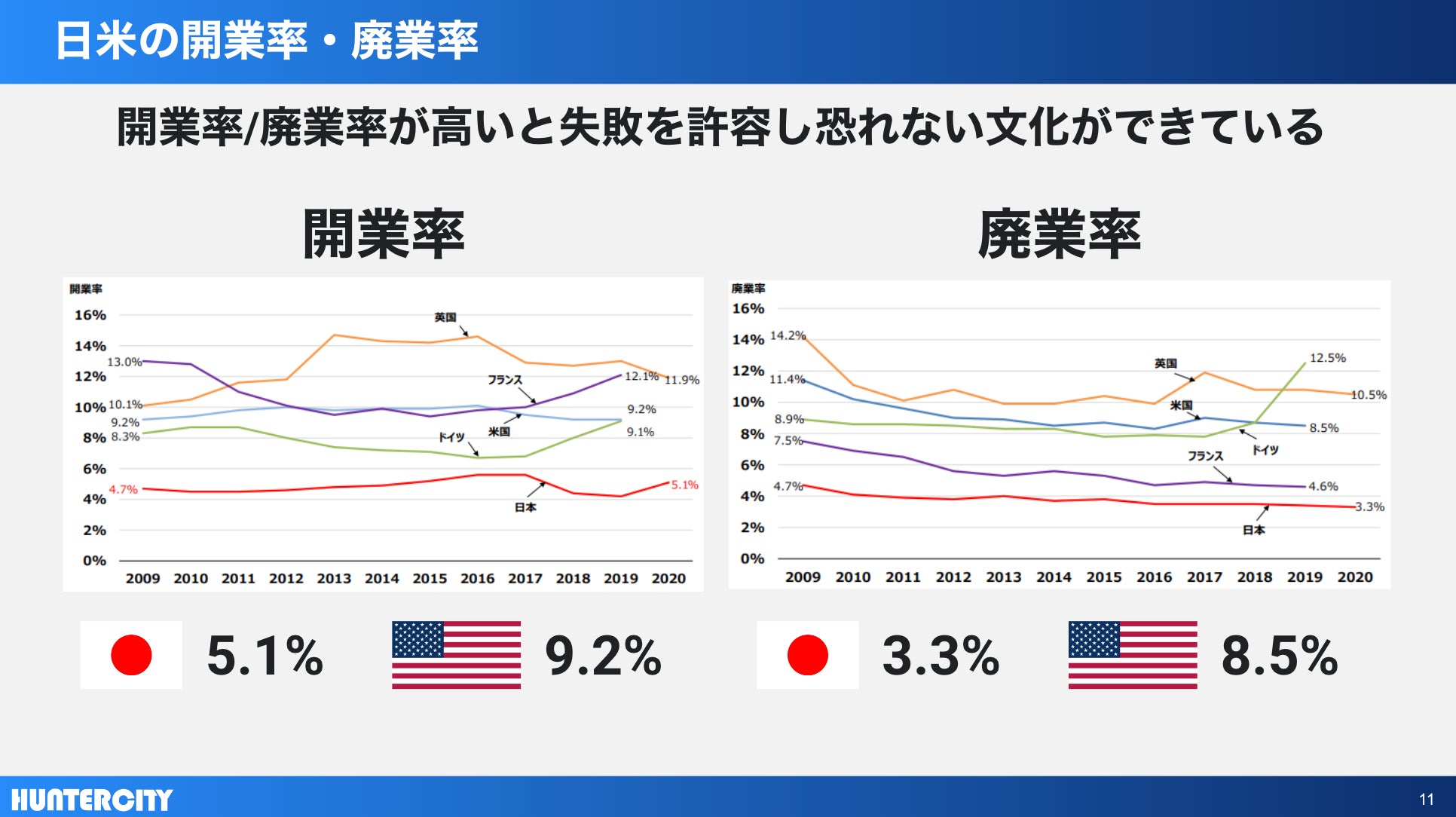 日米の起業率、廃業率を比較しても、日本の2倍近い数字を米国がだしており、起業家の失敗を金融機関が許容することで何度でも再挑戦ができる、起業しやすい土壌がカルチャーとなっています。私たちhackjpnは起業率の増加、ならびにベンチャー投資額を引き上げるとともに我が国のGDP20%の引き上げを目標とします。
