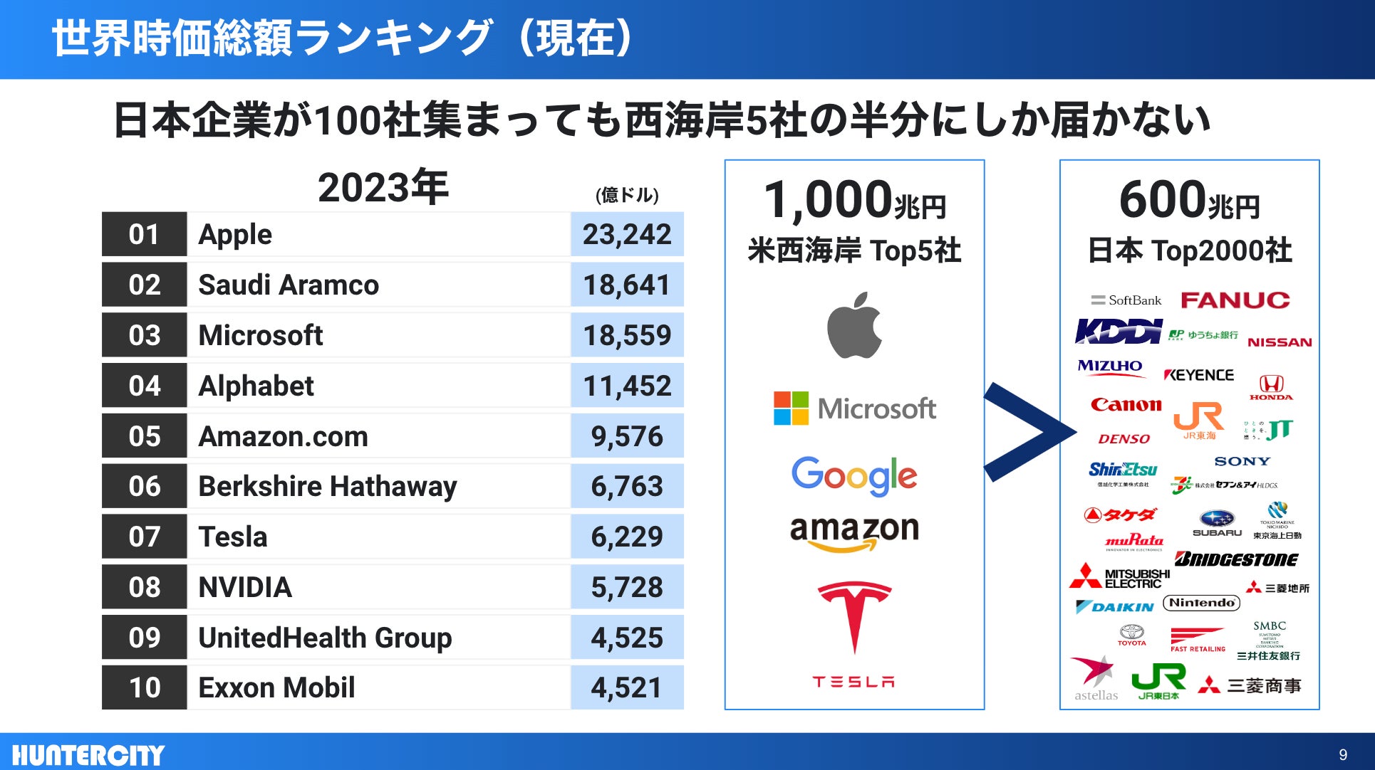 2023年現時点で日本の時価総額トップ2000社を並べても米国西海岸トップ5社の累計時価総額に劣り、我が国のGDPはグローバル諸外国に比較して停滞しております。