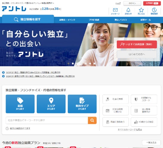 1997年2月より、独立のために必要な情報を集約した日本最大級の独立開業専門サイト。利用者の興味関心のある独立開業プランへの「資料請求&資料ダウンロード、説明会予約」機能を提供。先輩の成功談・失敗談や企業検索から説明会・個別面談会情報まで比較検討できるフォーマットで提供する点が特長。アントレの会員数は35万人を超え、約250件のフランチャイズ・代理店・業務委託募集といった独立開業プランを紹介することで、週2,500~4,000件の資料請求や説明会予約につながっている。(2023年10月現在)