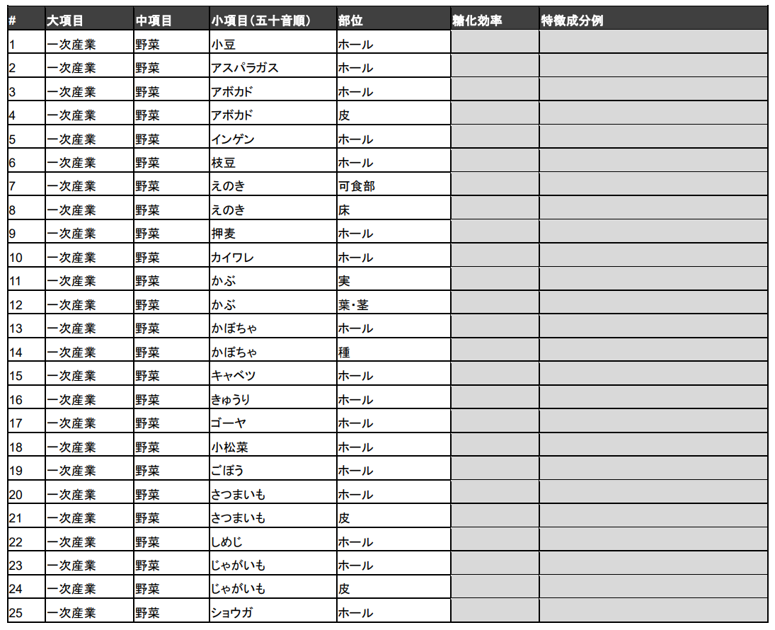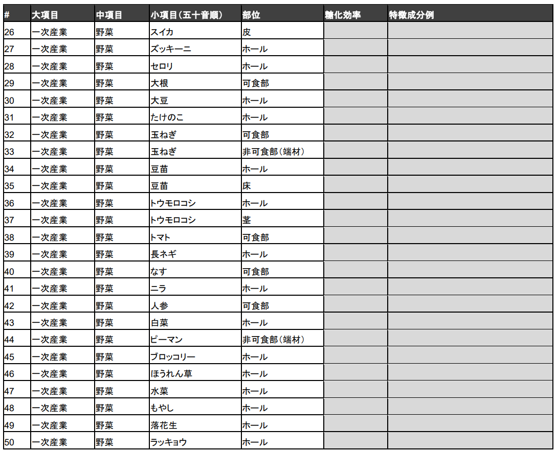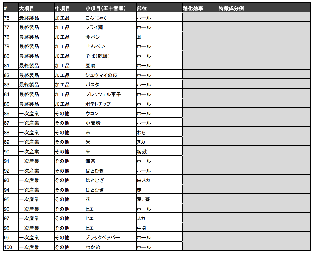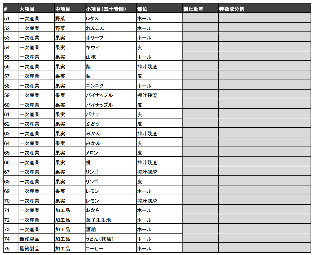 そこで当社は、野菜、果物、加工品といった、しばしば発酵アップサイクル技術の適用対象となりやすい100種類の未利用バイオマスについて、相対的な適用可能性や難易度に関するデータを公開することとしました(図2:試験データの一覧)。当社オリジナル酵素レシピを用いて、アップサイクルの初期段階として重要な工程である、酵素による糖化分解の実験結果を掲載しております。当データシートの提供により、今後も未利用バイオマスの再生・循環を推進してまいります。