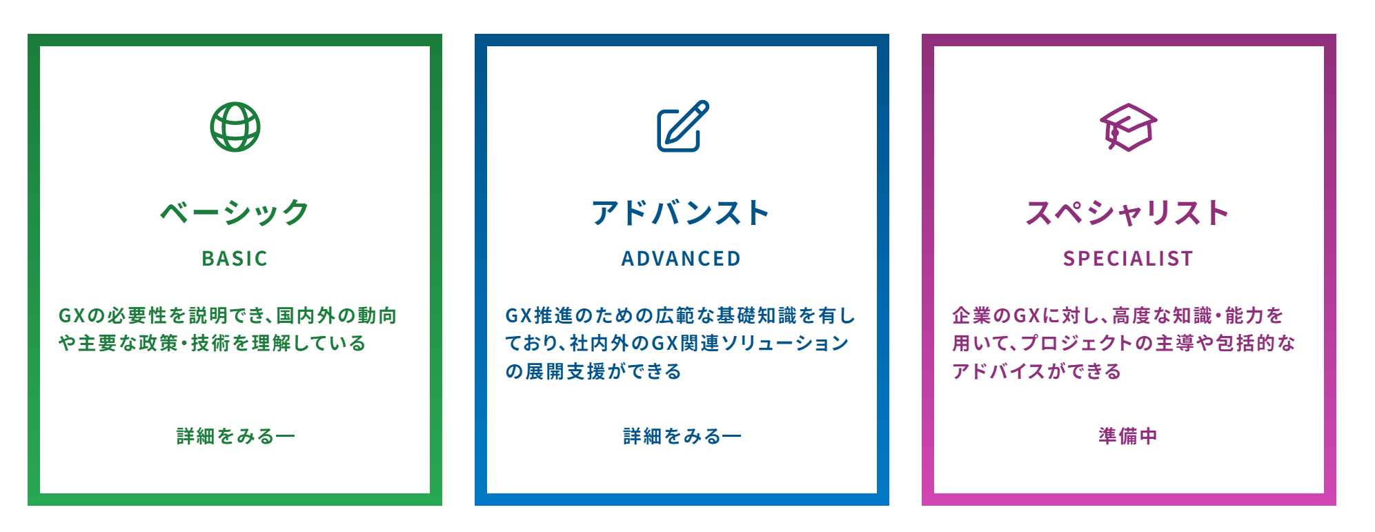 検定はベーシック/アドバンスト/スペシャリストの3つのレベルに分かれており、それぞれのレベルでGXに関連するリテラシーを問う検定となっていますので、業種や職種を限定せず、さまざまな目的での活用が可能です。