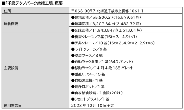 「千歳テクノパーク統括工場」は、敷地面積が55,800.37㎡、延べ床面積は11,943.84㎡の鉄骨造2階建て、札幌市を中心とする道央圏の物流を担う、アクティオと共成レンテムの合同工場です。
