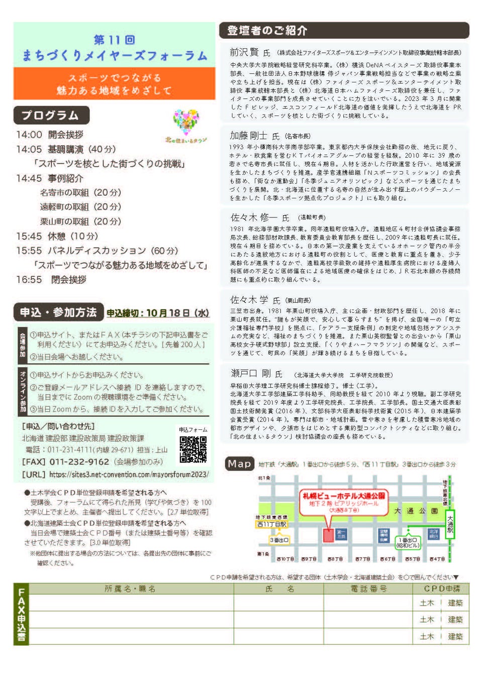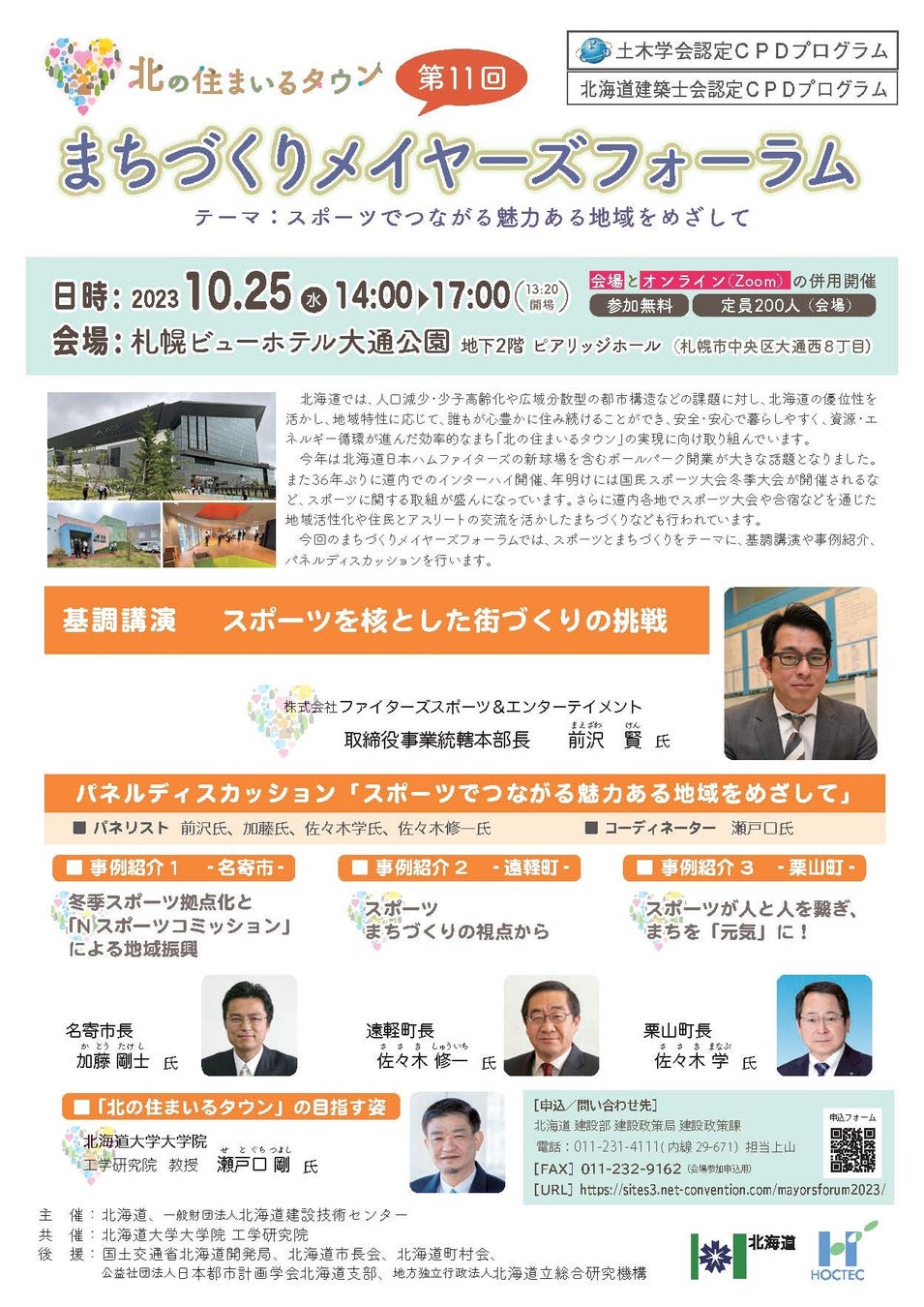 第11回となる「まちづくりメイヤーズフォーラム」では、スポーツとまちづくりをテーマに、株式会社ファイターズスポーツ&エンターテイメント 取締役事業統轄本部長 前沢 賢 氏をお迎えして基調講演をいただくほか、道内の市町村長による事例紹介やパネルディスカッションを行います。ぜひご参加ください。