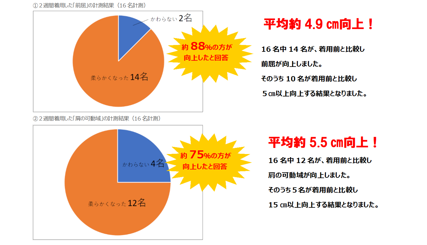 結果、立位体前屈は平均で約4.9cm、肩の可動域は平均で約5.5cmの向上を示しました。特に、肩こり、腰痛、膝痛などの身体の不調を抱える被験者の大半が、着用前と比較して不調が緩和されるという結果となりました。さらに、仕事に関する不調も改善が確認され、多くの被験者が仕事を楽に感じ、日々の疲労感が軽減されたと答えました。