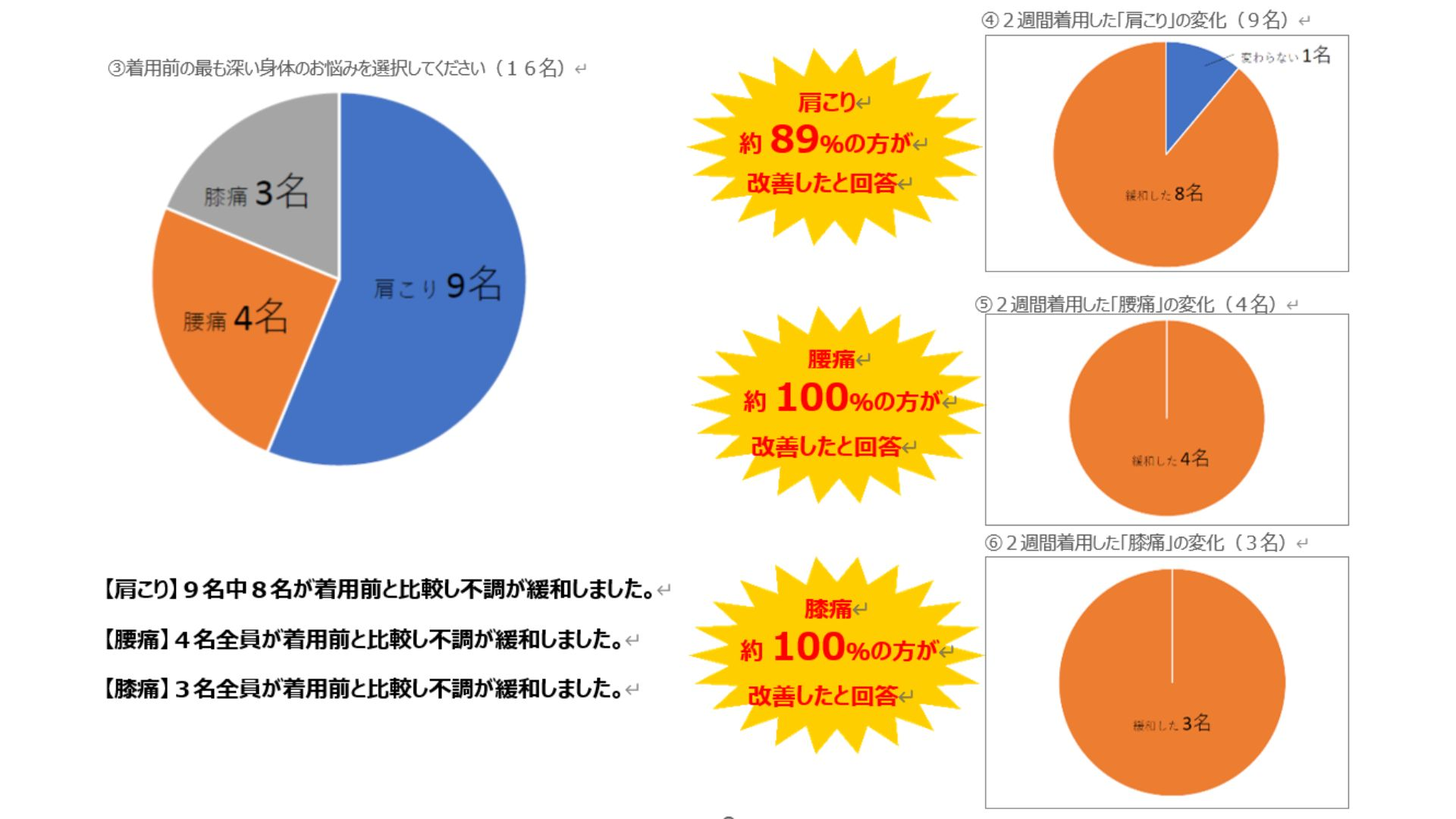 肩こりを感じていた被験者のうち8名、腰痛を感じていた被験者の4名全員、膝痛を感じていた被験者の3名全員が、不調が緩和されたと報告