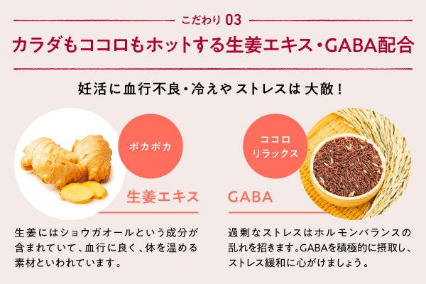 ストレスや冷えは、妊活をする男女に悪影響を与えます。生姜エキスを配合した、温かいお出汁を飲むことでポカポカな生活を応援。またGABAを配合しており、ココロもホットするようなひと時をサポートします。
