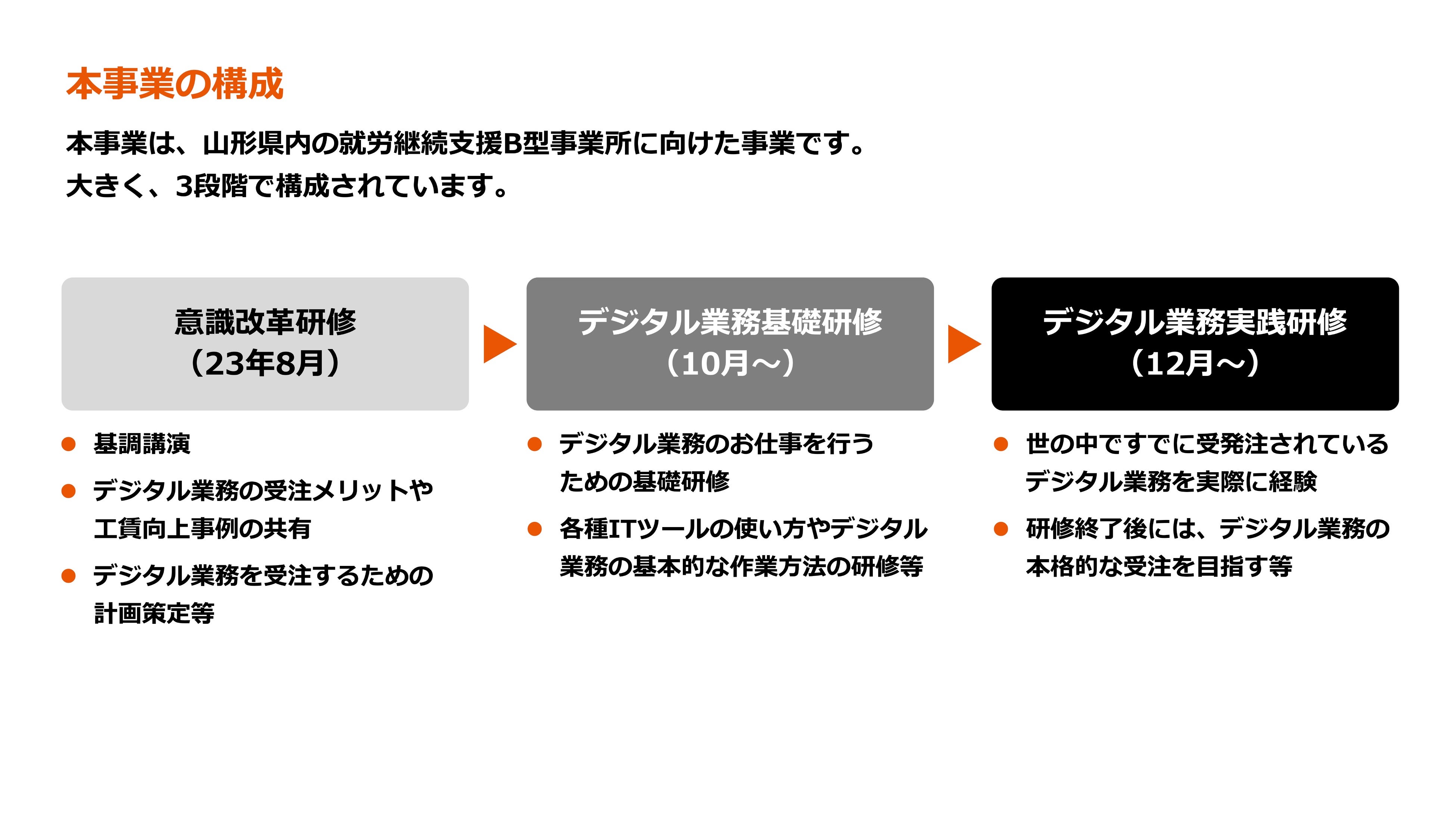 当社はこれまで約9年間、400種類を超える業務を企業から受注し、全国の就労継続支援事業所へ再分配を行い、新たな活躍機会及び労働市場の構造変革に取り組んで参りました。この経験とノウハウを活かし、今後企業から求められるデジタルスキルなどを基にした研修プログラムを策定し、山形県内の就労継続支援B型事業所へデジタル研修を実施いたします。