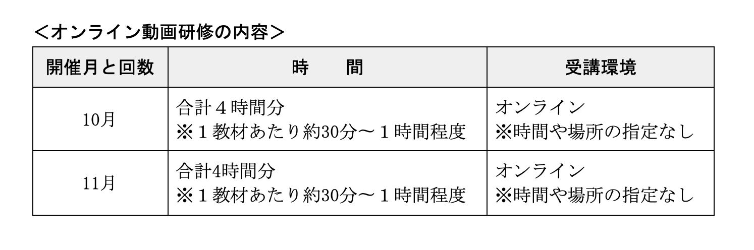 デジタル業務基礎研修では①座学及び②オンライン動画の2種類の研修を受講いただきます。座学は月2回、会場形式で行います。オンラインは、いつでも・どこでも・何度でも学ぶことができます。
