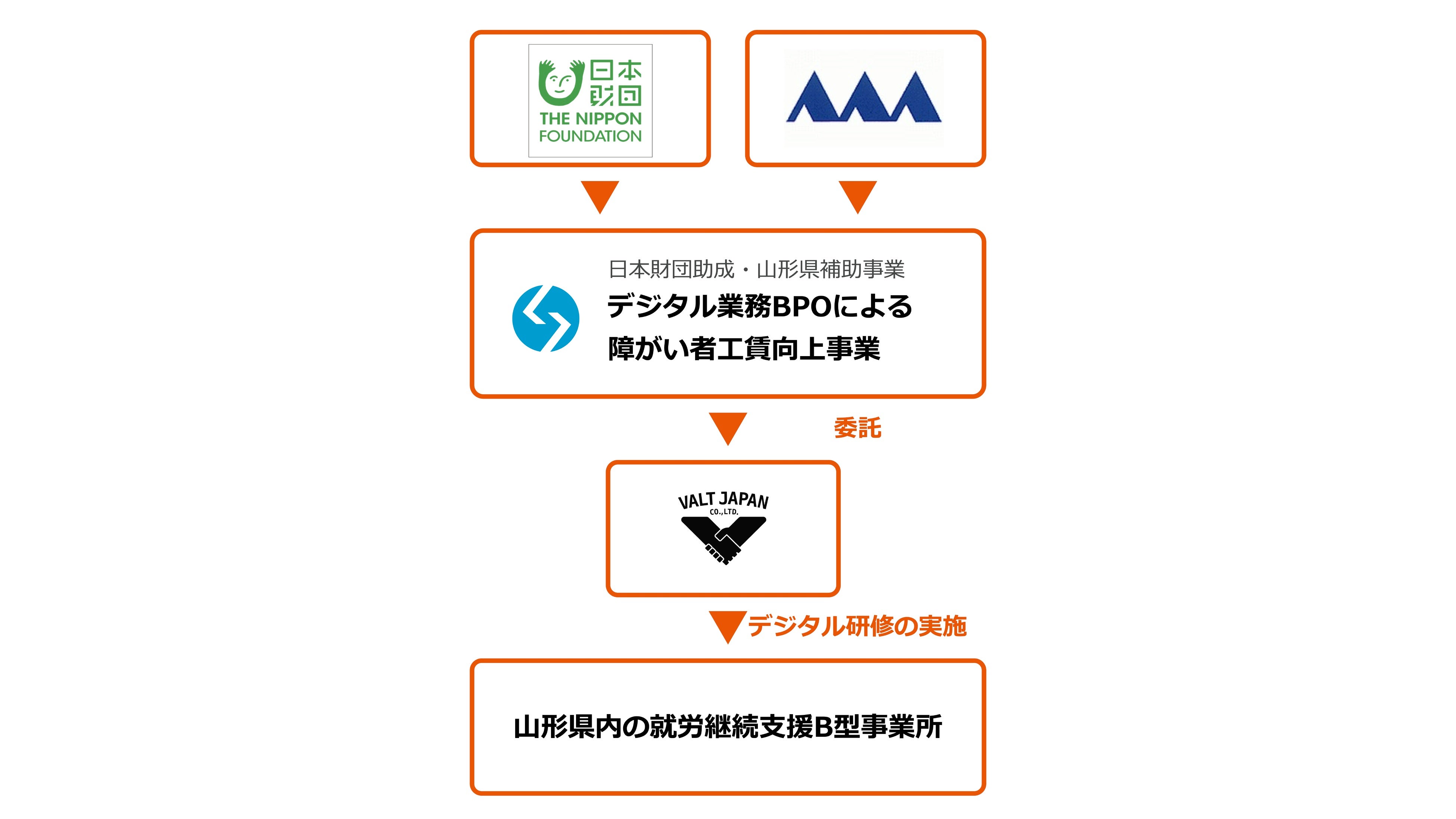 こうした社会的課題の解決を加速するべく、公益財団法人日本財団の助成及び山形県の補助を受けた事業である「デジタル業務BPOによる障がい者工賃向上事業」が開始されます。本事業は、就労継続支援B型事業所の活動内容を、内職等の非デジタル領域だけでなく、デジタル業務へ転換することにより、適正な工賃の確保及び障がい者の経済的自立を後押しし、さらに障がい者がデジタル業務に係るスキルを取得することにより、福祉的就労から一般就労への移行拡大を図ることを目的とした事業です。