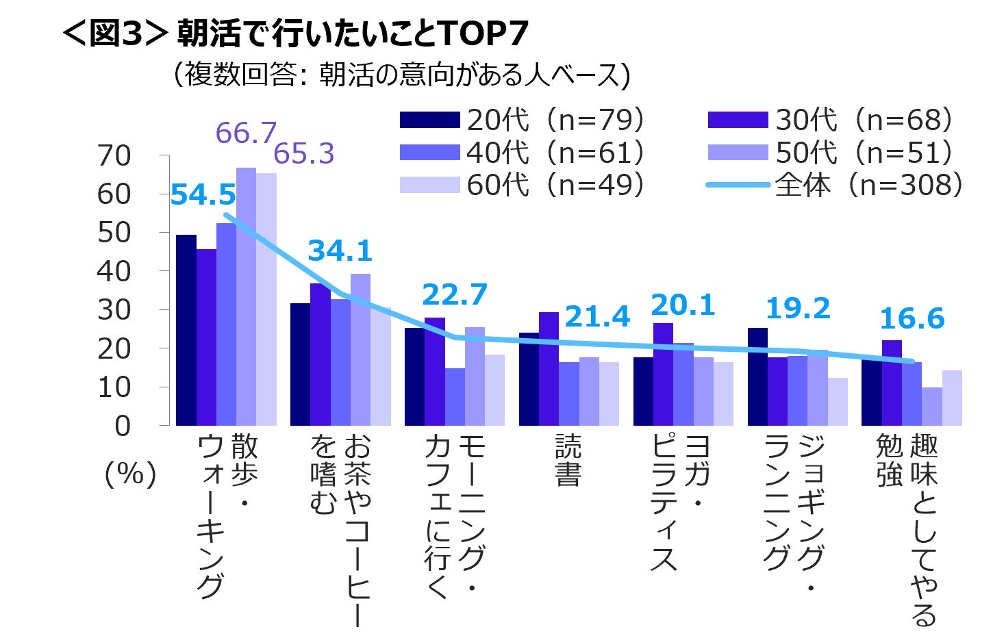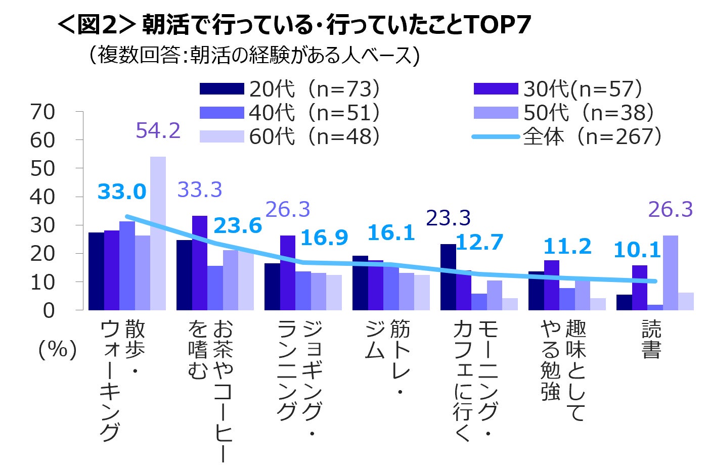 60代は「散歩・ウォーキング」、 30代は「お茶・コーヒーを嗜む」と「ジョギング・ランニング」、 20代は「モーニング・カフェに行く」の経験者が多い。<図2>