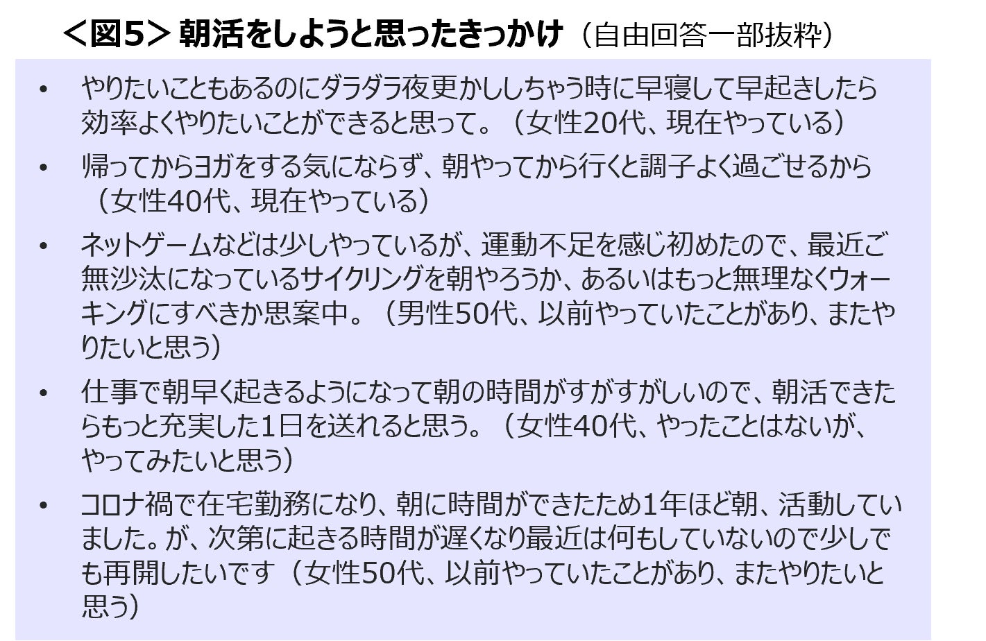 朝活を行いたい理由として、生活のリズムを整える、運動不足の解消、充実した一日を送るためという声があがった。<図5>