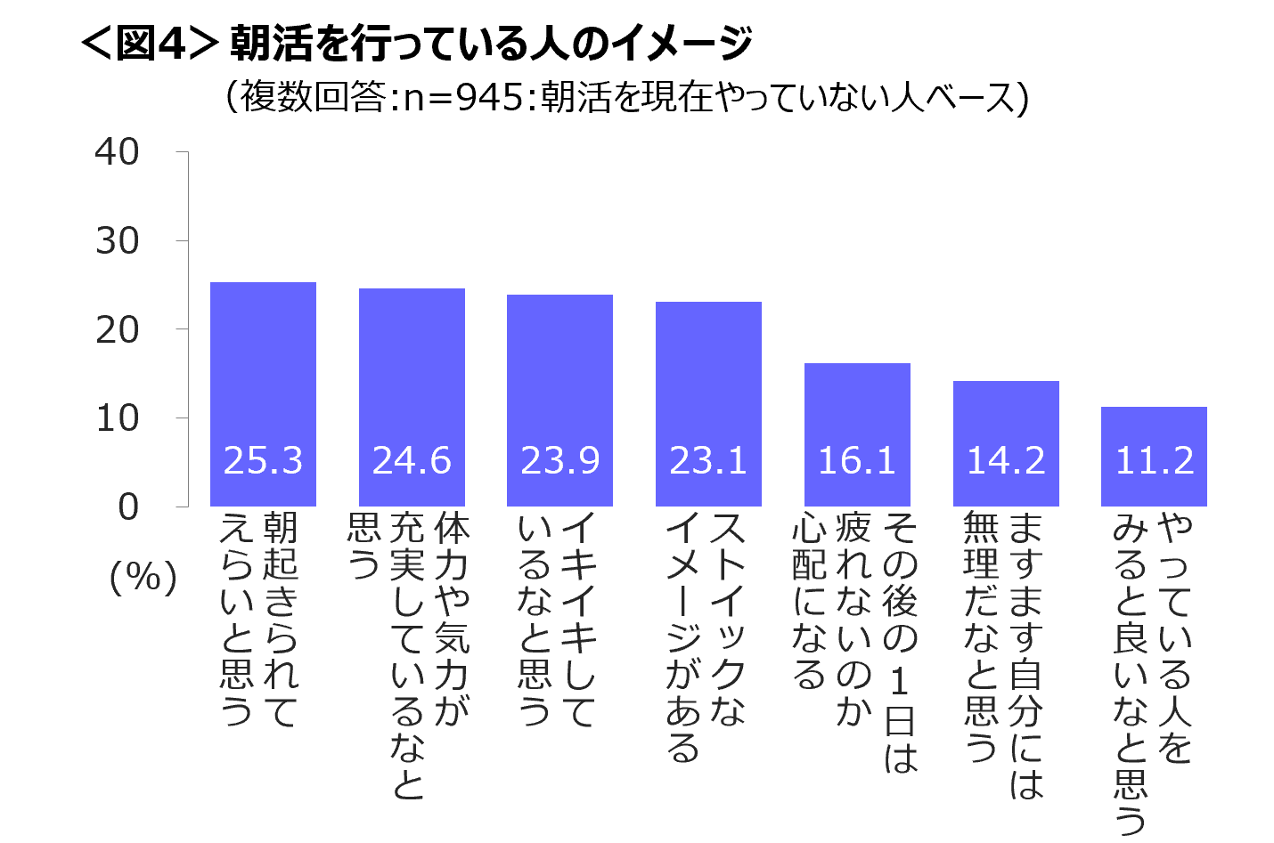 朝活を行っている人のイメージを聴取したところ、「朝起きられてえらいと思う」「体力や気力が充実しているなと思う」「イキイキしているなと思う」「ストイックなイメージがある」が上位あがり、ポジティブで憧れを含むイメージを持つ人が多い。<図4>