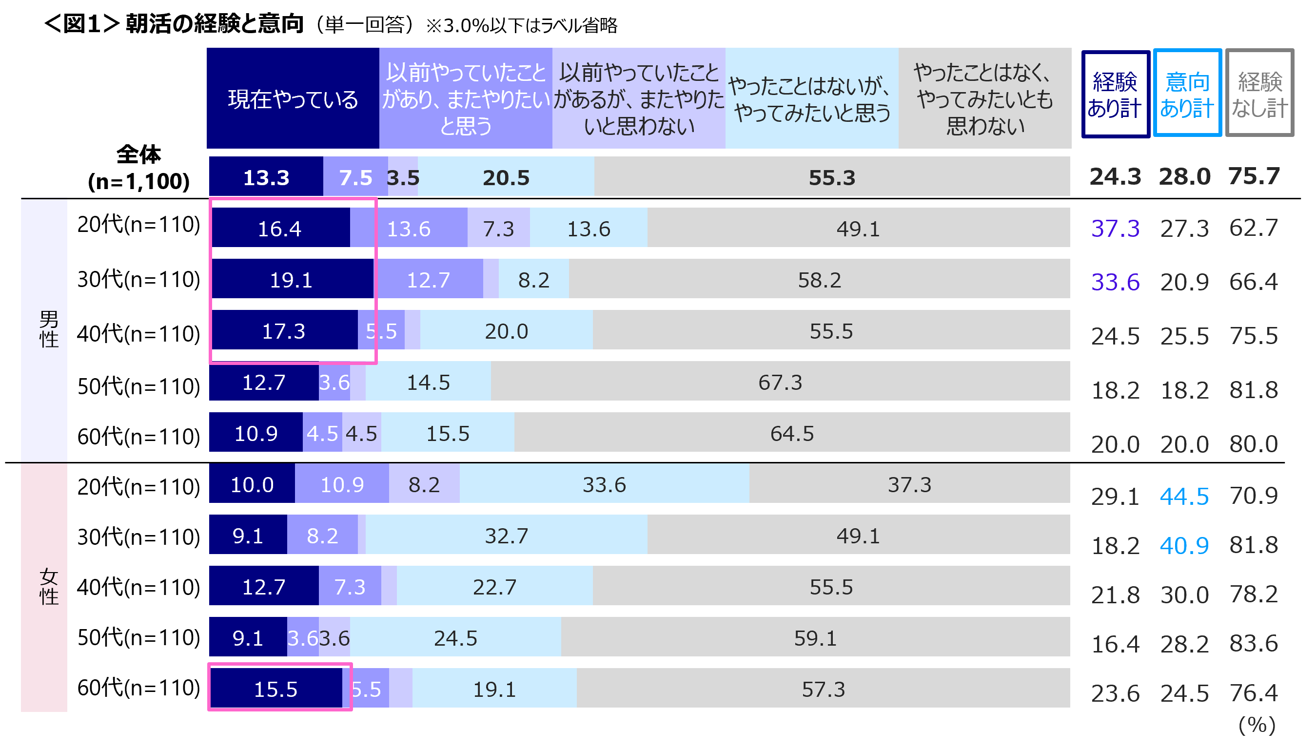 性年代別でみると、女性20・30代は朝活意向者が4割超えと高い。男性20~40代、女性60代は「現在やっている」人が多く、朝活経験者は男性20代の37.3%が最多となった。<図1>