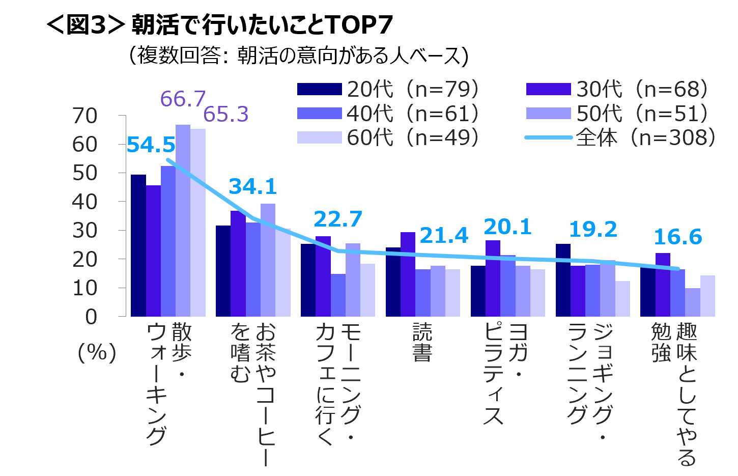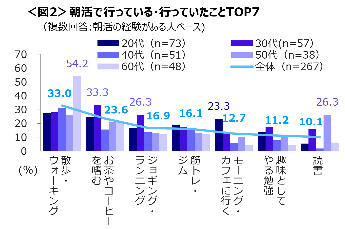 60代は「散歩・ウォーキング」、 30代は「お茶・コーヒーを嗜む」と「ジョギング・ランニング」、 20代は「モーニング・カフェに行く」の経験者が多い。<図2>