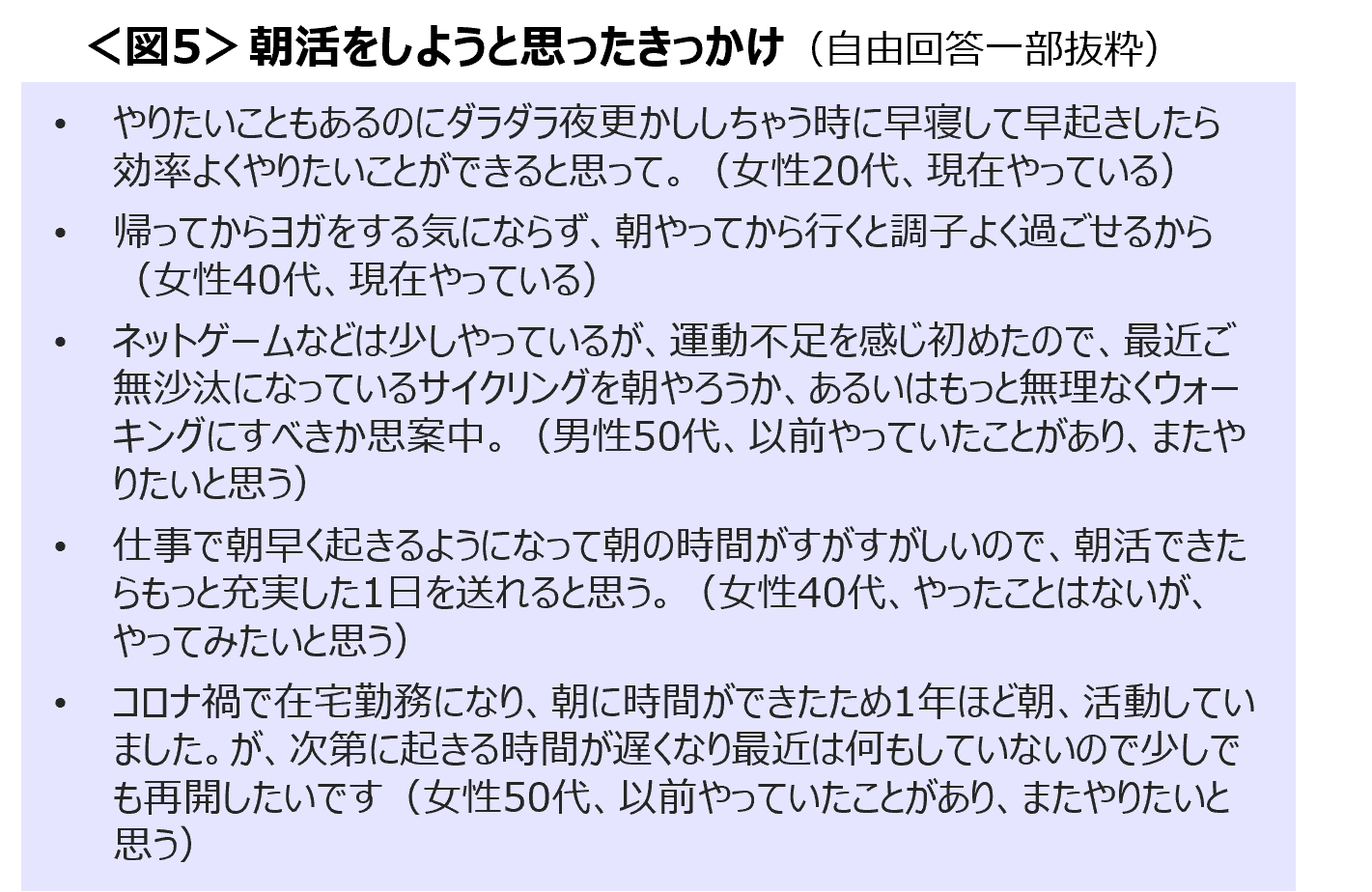 朝活を行いたい理由として、生活のリズムを整える、運動不足の解消、充実した一日を送るためという声があがった。<図5>