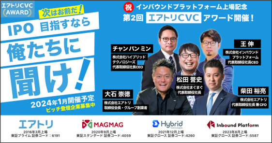 IT の力で、エアトリ旅行事業、IT オフショア開発事業、訪日旅行事業・Wi-Fi レンタル事業、メディア事業、投資事業(エアトリCVC)、地方創生事業とクラウド事業を手掛ける株式会社エアトリ(本社:東京都港区、代表取締役社長 兼 CFO:柴田 裕亮、証券コード:6191、以下当社)は、エアトリグループの株式会社インバウンドプラットフォーム(本社:東京都港区、代表取締役社長:王 伸、証券コード:5587、以下インバウンドプラットフォーム社)の上場を記念して、2024年1月に第2回エアトリCVCアワードの開催が決定いたしましたことをお知らせいたします。
