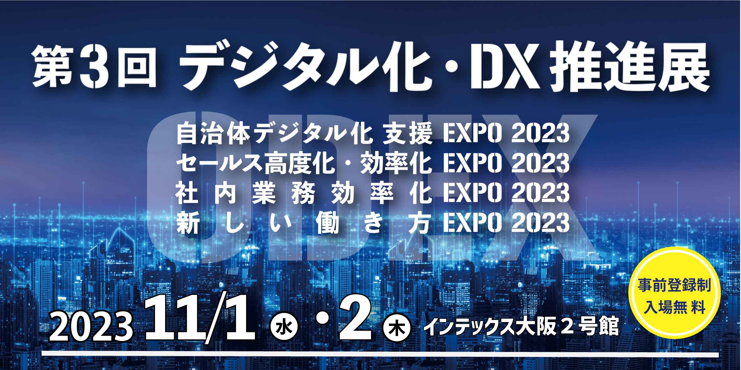 デジタル化・DX推進展は、大阪・東京・オンラインでリレー開催されるハイブリッド展示会です。出展企業及び来場者の需要に即し、「自治体デジタル化 支援 EXPO 2023」「セールス高度化・効率化 EXPO 2023」「社内業務効率化 EXPO 2023」「新しい働き方 EXPO 2023」の4展で展示会を構成することで、各展の専門性を高めています。