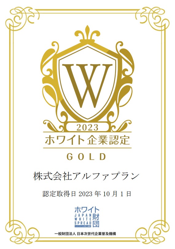 株式会社アルファプラン様が、一般財団法人日本次世代企業普及機構(通称:ホワイト財団)が運営する「ホワイト企業認定 ゴールドランク」を取得しましたことをお知らせいたします。