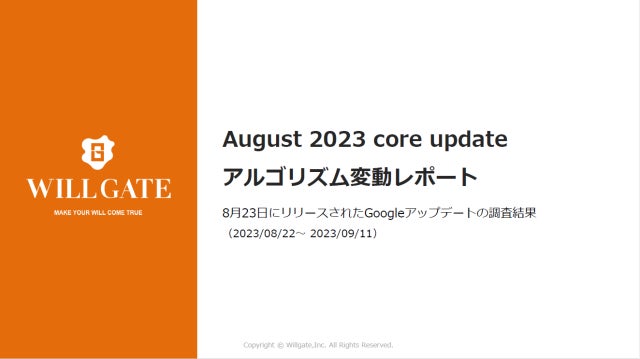 株式会社ウィルゲート(本社:東京都港区、代表取締役:小島 梨揮、以下「ウィルゲート」)は、2023年8月23日〜9月8日にかけてリリースされたGoogleアルゴリズムアップデート「August 2023 core update」で自社サイトのSEO流入に影響を受けた企業にむけて、「アルゴリズム変動レポート」を無料公開しました。