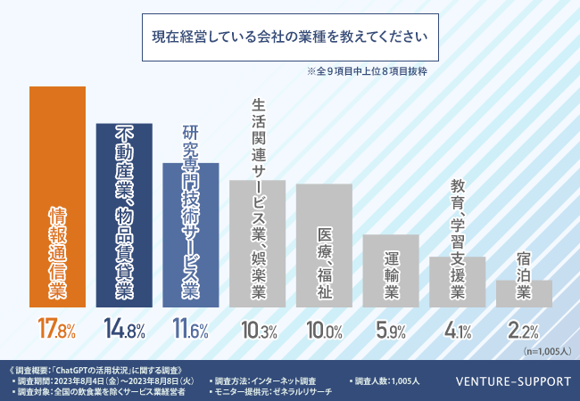 これらの業種の経営者に、ChatGPTの認知度調査を行った。