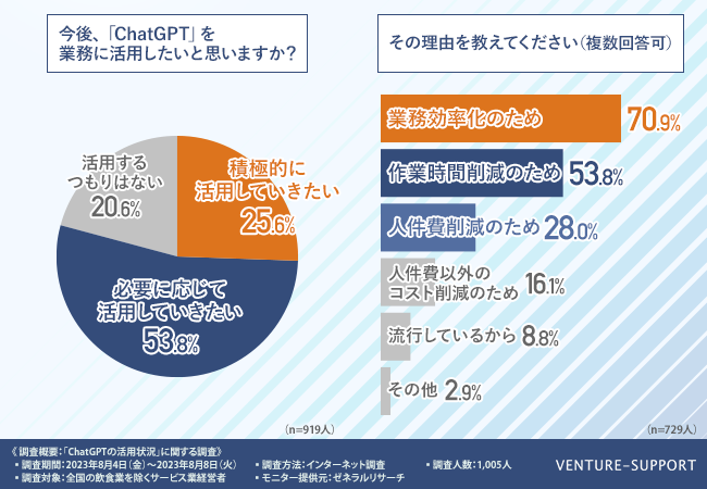 また、約8割の経営者が、業務効率化やコスト削減を目的として、今後、ChatGPTを業務に活用したいと考えていることも明らかになった。