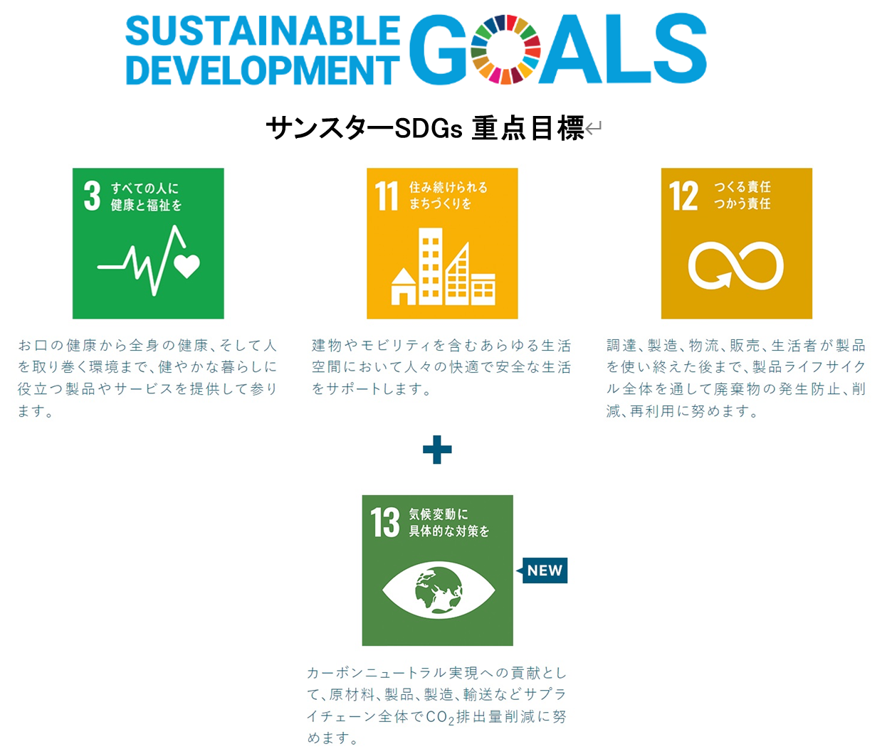 サンスターのSDGs重点項目として、これまで、ゴール3「すべての人に健康と福祉を」、ゴール11「住み続けられるまちづくりを」、ゴール12「つくる責任、つかう責任」の3つを掲げてきましたが、この度、ゴール13「気候変動に具体的な対策を」を新たに追加することを決定しました。