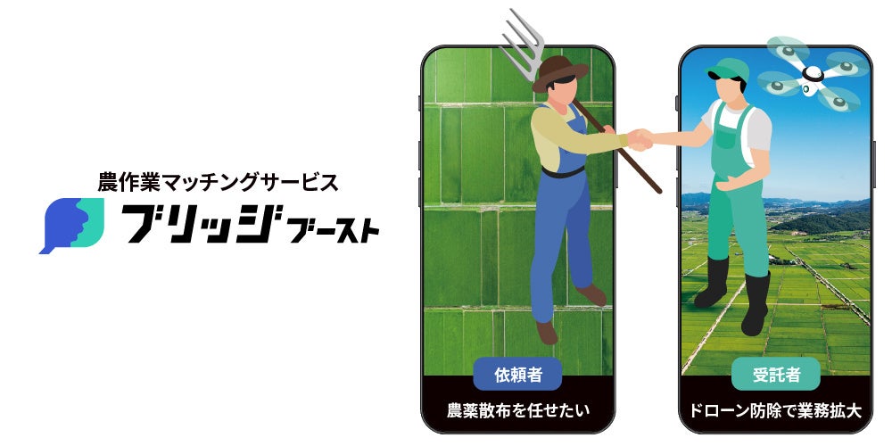 農作業を「依頼する人」と「受託する人」をつなぐ農作業マッチングサービス「ブリッジブースト」は、担い手不足の課題解決、農作業の外部委託へのニーズに対応するために誕生したサービスです。依頼者は、ドローン導入や操作習得は不要で、適切な時期に農薬散布を依頼することができます。受託者は、ドローン等を活用し農薬散布を受託できるので、新規顧客の発掘や時間の有効活用につながります。