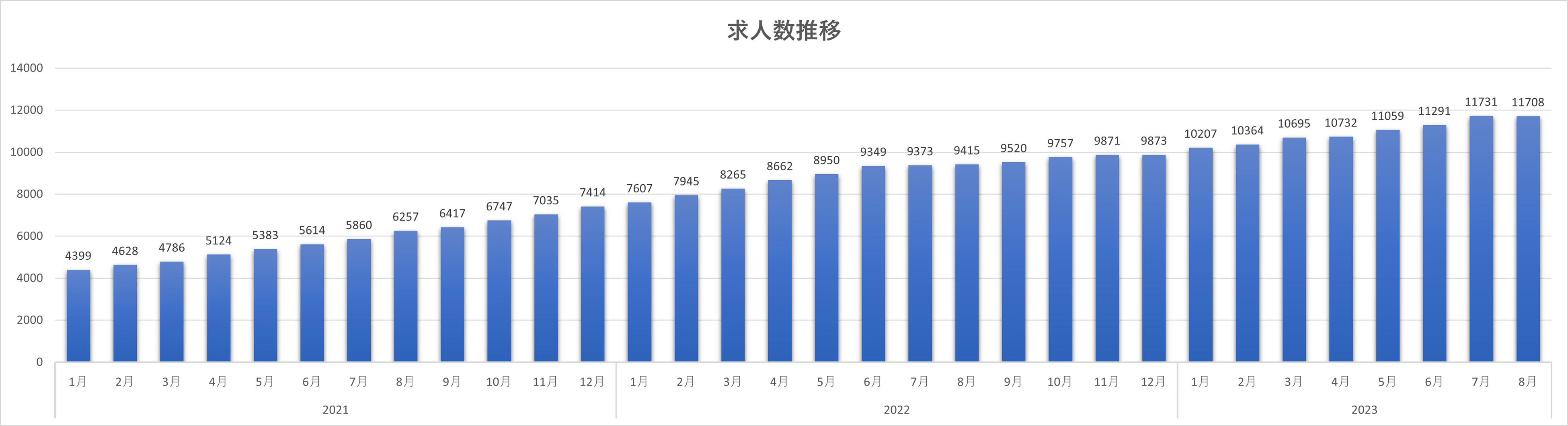 下図は、メーカー・製造業に特化した求人を取り扱うタイズの2021年1月~2023年8月の各月の求人数推移です。2021年1月より右肩上がりに増加し続け、2023年8月末時点では2021年1月比2.5倍以上という結果となり、過去最高水準となっております。