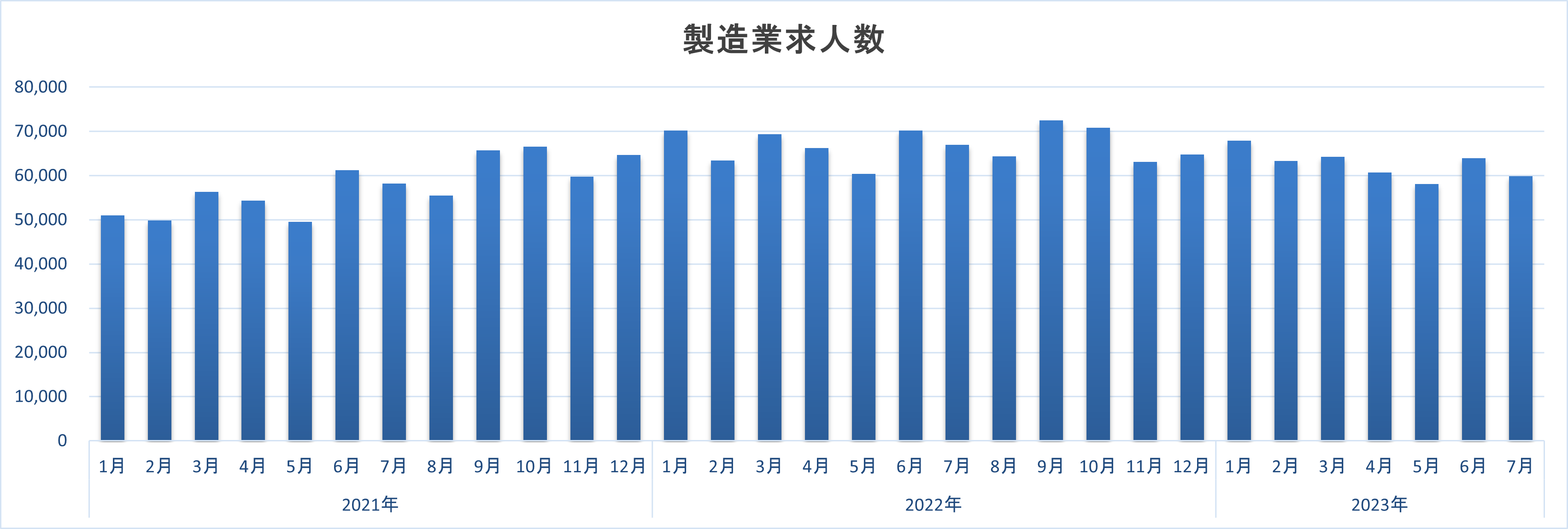 メーカー・製造業における全体の求人数は、2021年1月から50,000〜70,000の間を推移しており、横ばい傾向となっています。(※参考:一般職業紹介状況(職業安定業務統計) / 一般職業紹介状況 / ~令和5年8月 https://www.e-stat.go.jp/stat-search/files?page=1&query=%E7%AC%AC%EF%BC%92%EF%BC%90%E8%A1%A8%E3%80%80%E6%B1%82%E4%BA%BA&layout=dataset&stat_infid=000040106199&metadata=1&data=1)
