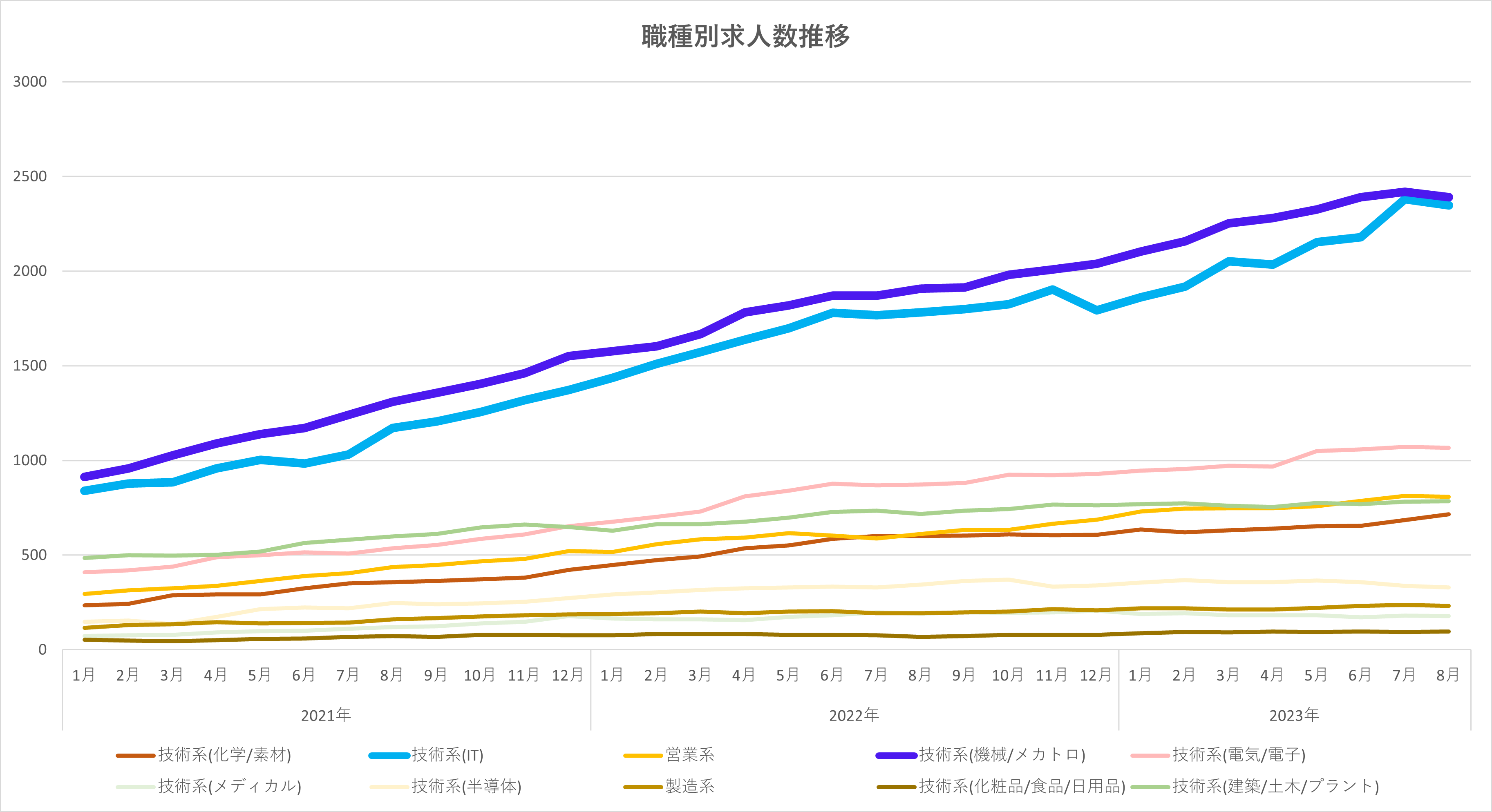 下図は、タイズにおける2021年1月~2023年8月各月の職種別求人数推移です。タイズ全体の求人数推移増加にあたり各職種別求人推移も右肩上がりに増加し続けている中、対象期間による求人数伸び率については機械系技術職、IT系技術職の2種が上位となっており、2023年8月時点では2021年1月時点と比べ約2.5倍となっています。