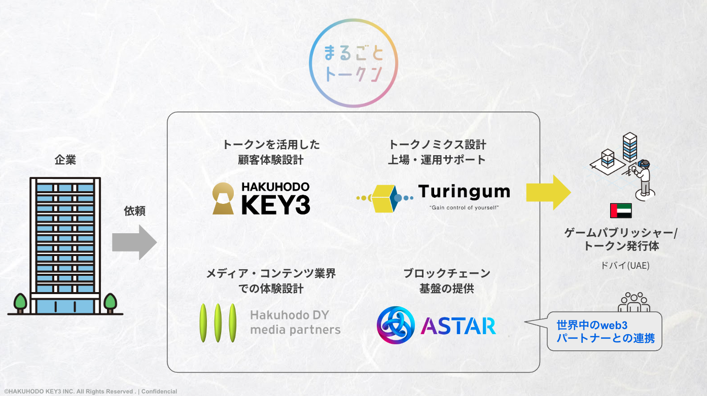 本ソリューションは、事業戦略構築、及びマーケティング企画に強みを持つ博報堂及び博報堂キースリーと、トークンエコノミクス設計、トークン発行・運営の実績を持つチューリンガム、web3インフラの基盤となるブロックチェーンの開発提供と、国内外の主要なweb3プレーヤーとの連携に強みを持つAstar Network、グループ横断でNFT・ブロックチェーン技術を活用したコンテンツビジネス開発プロジェクト「Play Asset 」を推進する博報堂DYメディアパートナーズ、が連携して、企業のトークン活用を推進するオンボーディングプログラムです。