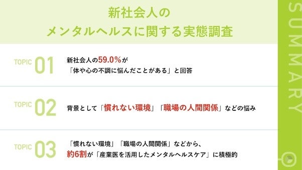 まず、新社会人の約6割が体や心の不調に「悩んだ経験がある」と回答しました。「疲れやすい」や「ストレスが溜まる」などの不調の悩みが多く、「慣れない環境」や「職場の人間関係」などが背景として浮き彫りになりました。また、「体の不調」よりも「心の不調」に注意している理由としては「様々な不調に繋がるから」や「回復に時間がかかるから」などが挙がりました。メンタルヘルスのために意識していることは、「睡眠時間を十分に取る」が63.0%で最多となりました。また、約6割が産業医を通じてメンタルヘルスケアを積極的に実施したいと回答しました。