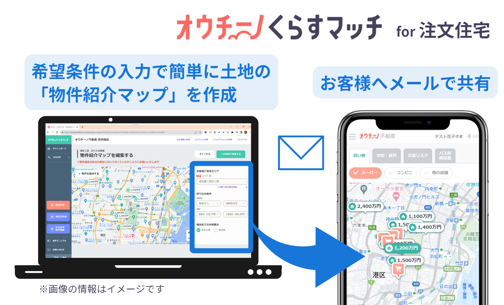 「くらすマッチ for 注文住宅」は、このような土地が決まっていないお客様に対して、ハウスメーカーや工務店の担当者が希望条件に合う土地と周辺環境情報を含む「物件紹介マップ」を簡単に作成し、分かりやすく提案できる機能です。また、希望エリアでの新着の土地物件や価格推移といった情報を継続的に提供できるほか、お客様の検討状況に応じて、見学案内等を適切なタイミングでご案内することで、お客様の理想の家づくりのための土地選びをサポートすることができます。