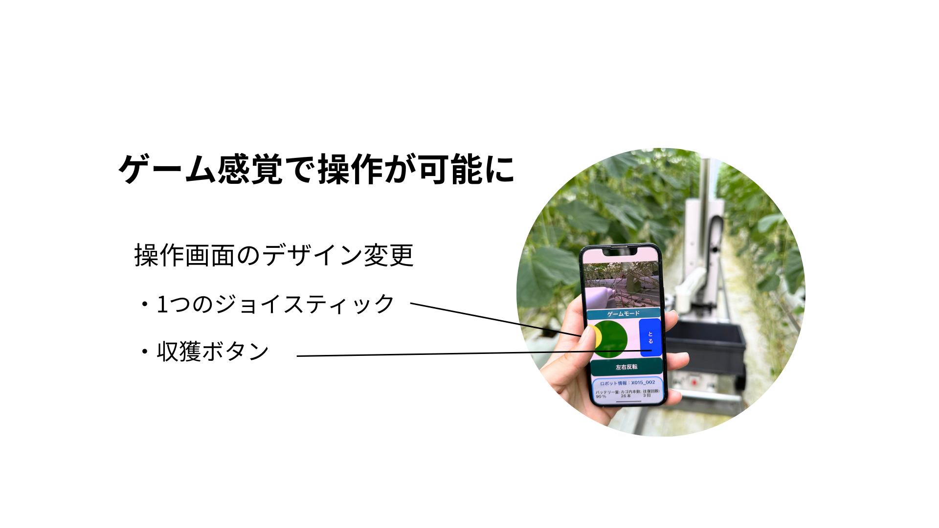 1つ目は、1つのジョイスティックと収穫ボタンのみのシンプルな操作画面を実装しました。この結果、アームの移動からロボット台車の移動、さらには収穫まで、すべての工程を少ない操作入力で、ゲーム感覚で体験できるようになりました。