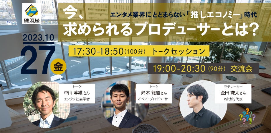 こうした状況を背景に、『エンタメビジネス全史』『推しエコノミー』の著者・エンタメ社会学者の中山淳雄氏、クリエイター・ファンコミュニティ形成を専門としている、イベントプロデューサーの鈴木龍道氏を講師に、今年から活動拠点を京都に移し活躍中のデザインストラテジストの金田謙太氏をモデレーターにお迎えし、今、注目のファンマーケティングについての事例や分析、経験談などを通して、これからの時代のプロデューサーに求められるスキル、京都の強みを活かすアイデアなどについて語っていただきます。