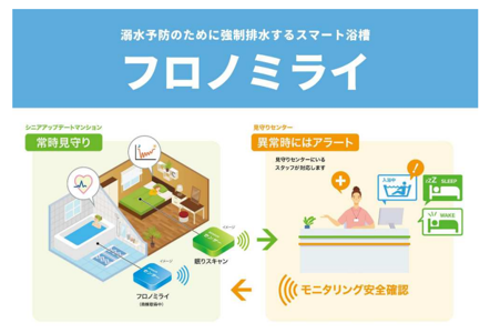 フロノミライは、入浴中の溺水を防止するための見守り・強制排水装置です。現在は主に高齢者のヒートショックを対象とし、シニア向けスマート賃貸マンション「ライフケア吹田」(大阪府吹田市内本町 3-25-16)に設置しています。浴槽下にある空気圧センサーで、入浴中の心拍、呼吸、体動を検知し、異常があれば強制排水して溺水を防ぎます。同時に有人の見守りセンターに通報され、遠隔で 119 番通報とオートロック解除。救急隊員が玄関を解錠し、速やかな搬送が可能となります。