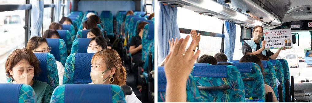 観光バスを貸し切って、19名のにんべんだしアンバサダーの方にご参加いただきました。「つゆの素ゴールド」を使ったメニューをシェアしたり、景品をかけてのクイズ大会をしたりして盛り上がりました。