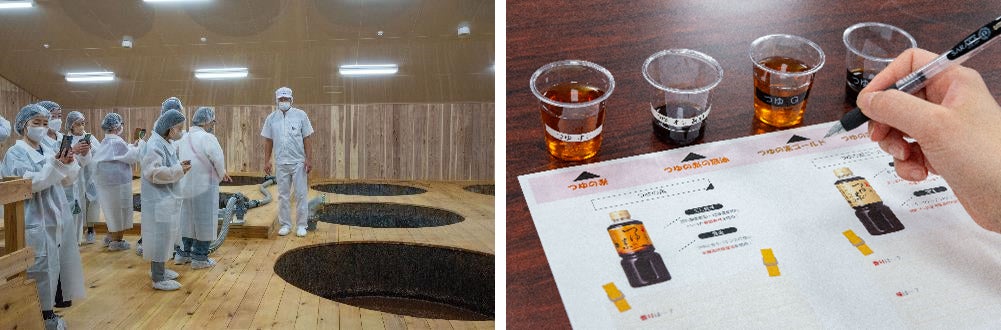 ③ちば醤油株式会社見学「つゆの素シリーズ製造工場の見学」、座学、つゆの素飲み比べ